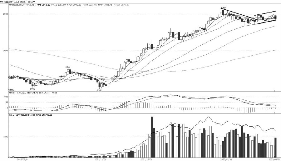 纯碱2305合约周线上自2月初见顶3069元/吨以来,维持高位振荡,向上未突破3000元/吨压力,向下未跌破10周均线的支撑。日线上,2月初以来,持仓、成交维持振荡下降的态势,周一再度大幅减仓,显示主力多头主动减仓意愿明显;中短期均线依然向上,仍对期价有一定支撑。综合看,期价在3000元/吨遇阻,展开区间振荡。操作上,可以关注40天均线失守后的短线回调机会,在打破僵局前暂时日内为主。(中原期货 李卫红) (责任编辑:admin) |