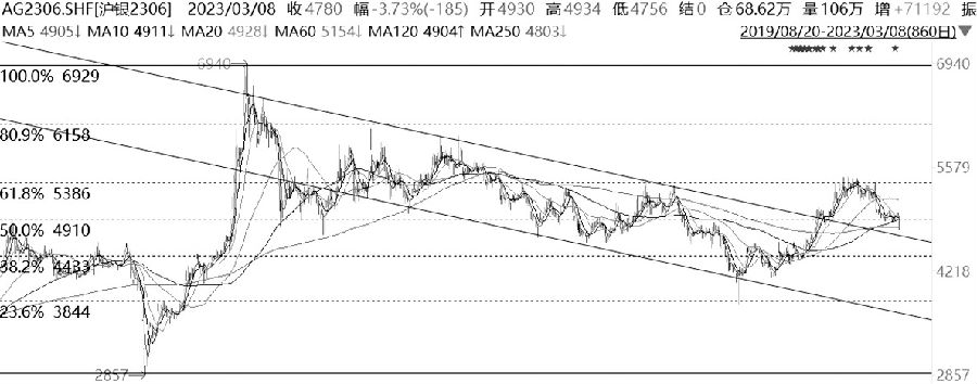 2022年4月底,高硫燃料油期货上冲5700元/吨上市以来的高点受阻后,开始大幅回落,直至跌至黄金分割0.382对应的2672元/吨支撑位才逐步止跌企稳。之后,高硫燃料油期货振荡上行,向黄金分割0.5对应的3200元/吨挺进。 均线方面,均线系统呈现多头排列,显示价格走势呈现强势的状态。指标方面,MACD指标金叉后持续发散,没有明显的黏合迹象,但是出现了顶背离的迹象;KDJ指标、RSI指标均高位黏合,给出看空信号。量仓方面,近期的上涨出现了一定的量仓下降,上涨动能有所减弱。 综上,高硫燃料油反弹至压力位附近,指标走弱,量仓下降,短期向上突破3200元/吨压力的难度较大,价格或回调。操作上,前期多单适量止盈,空仓投资者可背靠3200元/吨轻仓试空。 白银 放量下跌
