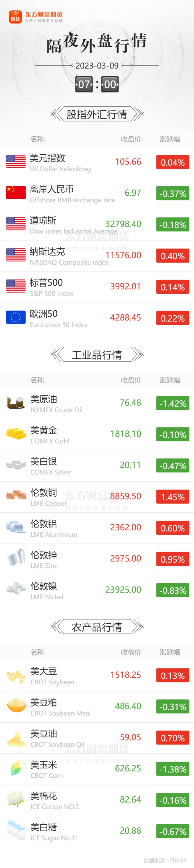 外盘收报![]() 每日精选上百吨“掺假”金条运往中国?上金所称有关报道“背离真相”!澳洲铸币厂:给中国客户的金条纯度和价值没问题 被鹰派言论吓破胆?上期所白银大跌3.71%!半夏投资:商品3-4月会有机会 狼真的来了!“新美联储通讯社”解读 :3月加息50个基点 宏观产经 乘联会:中国2月狭义乘用车零售销量同比增加10.4%。2月新能源乘用车零售销量达到43.9万辆,同比增长61%,环比增长32.8%。今年前2个月,新能源乘用车零售销量达到77万辆,同比增长22.8%。 新华财经:数据显示,美国ADP就业人数2月增长24.2万,好于市场预期的增加20万人就业。其中,未离职人员工资同比增长7.2%,较上月下降0.1个百分点。跳槽人数增幅为14.3%,而1月份为14.9%。ADP首席经济学家Nela Richardson表示,工资增长的适度放缓本身不太可能在短期内迅速降低通胀。 财联社:美东时间周三,美联储主席鲍威尔二闯国会山,让市场惊喜的是,预期中的“二连击”并未到来,鲍威尔反而弱化了此前的鹰派论调。鲍威尔强调,美联储尚未就未来加息步伐做出任何决定,并表示这将取决于即将公布的就业和通胀数据。这意味着50个基点的加息幅度并非是板上钉钉。 品种资讯黑色系&有色系期货 螺纹钢:2023年2月下旬,重点统计钢铁企业共生产粗钢1776.16万吨、生铁1602.16万吨、钢材1807.88万吨。其中粗钢日产222.02万吨,环比增长6.09%。本旬全国日产粗钢268.93万吨、环比增长5.16%,日产生铁245.07万吨、环比增长5.11%,日产钢材386.15万吨、环比增长4.95%。(中钢协) 截至3月8日,全国建材社库1189.93万吨,较上周减少26.32万吨,下降2.16%;厂库752.72万吨,较上周减少46.50万吨,下降5.82%;产量465.57万吨,较上周增加12.61万吨,上升2.78%。 中西部建材社库518.16万吨,较上周减少7.50万吨,下降1.43%;厂库294.68万吨,较上周减少23.77万吨,下降7.46%;产量165.82万吨,较上周增加0.70万吨,上升0.42%。(钢谷网) 3月8日,全国174家长、短流程代表钢厂废钢库存总量435.25万吨,较昨日增2.98万吨,增0.69%;库存周转天10.4天,较昨日增0.2天;日消耗总量38.53万吨,较昨日降0.06%;日到货总量41.51万吨,较昨日降0.05%。(Mysteel) 煤炭:露天煤炭矿山安全整治开启,供给短期收紧,煤价反应敏感。虽然下游电煤步入淡季,但各地工程项目相继开工,终端建材成交活跃,水泥煤、砂石运输需求释放,沿海煤炭运价企稳上行。(上海航运交易所) 铝:3月6日,电解铝企业云南其亚金属有限公司的相关负责人告诉红星资本局,“2月中旬就收到了限电通知,2月27日已经全面完成(压减负荷要求)了。”同日,上市公司神火股份(000933.SZ)董秘也向红星资本局表示,限电调整后,工厂电解铝产能已减少40%。(红星资本局) 镍:“妖镍风波”还在继续。3月8日,港交所(00388.HK)发布公告称五家投资机构向其子公司伦敦金属交易所(LME)和结算公司(LME Clear)提出索赔,索赔金额超过1000万英镑(折合人民币超8200万元)。(界面新闻) 农产品期货 生猪:2023年2月,羊肉批发价格为68.65元/公斤,比上月上涨0.25%;猪肉、牛肉、鸡肉和鸡蛋的批发价格分别为20.97元/公斤、77.23元/公斤、18.41元/公斤、10.32元/公斤,比上月分别下降11.59%、0.83%、1.45%、6.27%。(农业农村部) 玉米:本月2022/23年度中国玉米生产、消费、贸易和价格预测数与上月保持一致。随着天气转暖,玉米储存难度加大,基层农户售粮积极,市场供给增加,由于前期生猪养殖亏损、蛋禽养殖利润下滑,玉米饲用消费需求疲软,此外玉米深加工企业普遍按需采购,企业补库意愿不强,市场收购较为谨慎,粮食企业收购进度同比偏慢。据国家粮油信息中心监测,截至2月28日,东北三省一区各类粮食企业累计收购玉米7206万吨,同比减少350万吨。目前农户手中余粮压力犹存,国内玉米市场整体弱势运行。(农业农村部) 大豆:本月对2022/23年度中国大豆供需形势预测与上月保持一致。国内方面,节后大豆市场需求缓慢恢复,随着气温回升,农户存储大豆难度加大,售粮积极性不断提升,预计价格短期平稳运行。国际方面,美国新季大豆播种面积低于市场预期,但目前气象条件好于去年,且期末库存预计处于高位,巴西大豆收获全面展开,产量预计大幅增加,全球大豆供应逐渐转向宽松,预计价格短期受南美天气影响震荡运行。(农业农村部) 豆粕:据业内知情人士表示,目前饲料企业采购成本下降明显,豆粕价格跌幅较大,玉米价格也略有下调。而饲料企业的豆粕库存多随用随采,目前企业一般会储备15天左右的库存,因此在市场竞争下饲料价格也会跟随豆粕等现货价格波动进行调降。3月以来不少饲料企业先后发布了饲料降价通知。据饲料行业信息网统计,各企业饲料价格下调幅度最大的是蛙料,降价约300元/吨,畜禽料降幅普遍在50-100元/吨。(新华财经) 棉花:本月对2022/23年度预测数据不作调整。国内经济稳步复苏,下游纺织品服装消费预期增强,棉花销售进度明显加快。据国家棉花市场监测系统数据,截至3月2日,全国新棉销售率为53.0%,同比提高13.7个百分点。考虑到棉花供应总体充足,“金三银四”消费回暖情况有待观察,棉花价格暂维持上月预测值不变。(农业农村部) 食用植物油:本月预测,2022/23 年度中国食用植物油产量、消费量、进口量均与上月保持不变。截至2月底,长江中下游及西南地区油菜大部处于现蕾抽薹至开花期,其中四川盆地南部油菜进入开花盛期。近期长江中下游地区多晴好天气,温度条件适宜、光照充足,利