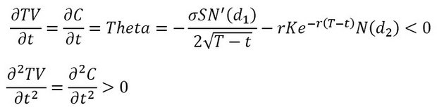 通过上述分析对于性质1、2能较好地理解。下面我们用时间价值对标的资产价格和时间分别进行求导,更进一步解释为什么平值期权的时间价值最大,以及期权时间价值会加速衰减。为简单起见,下面推导均以看涨期权为例。