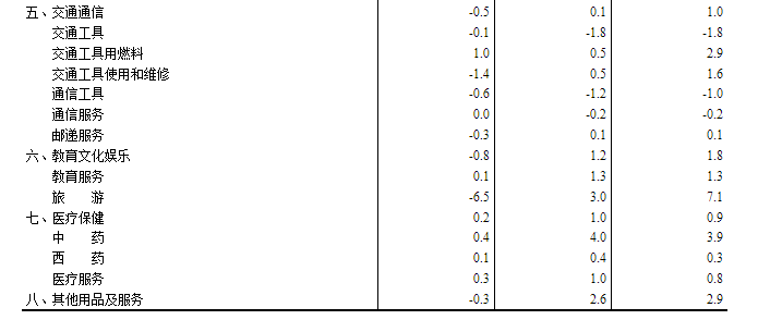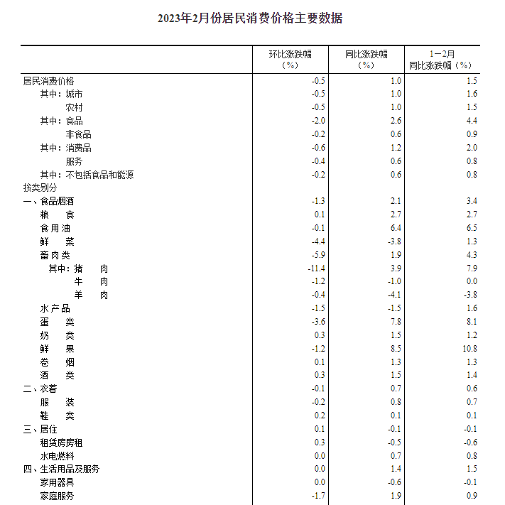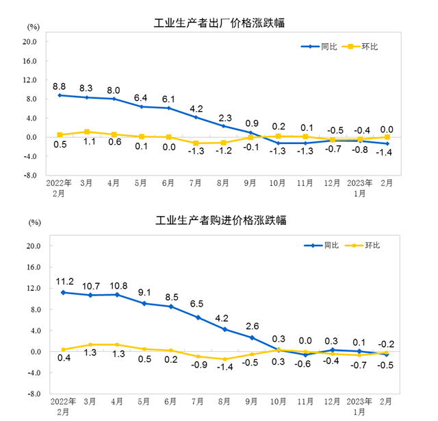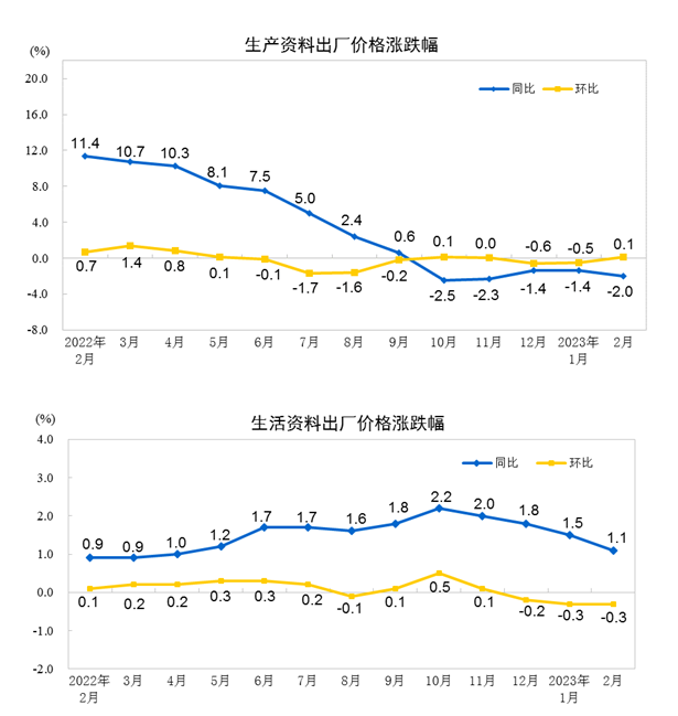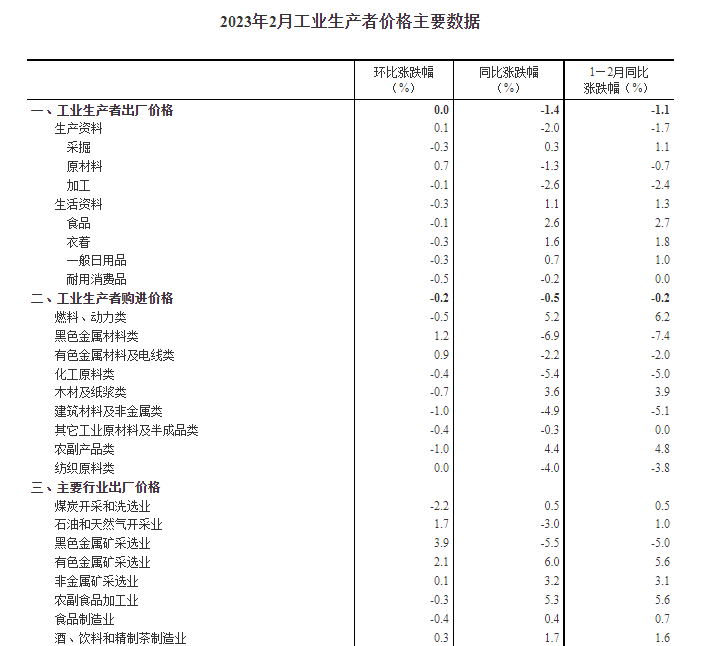 2023年2月份居民消费价格同比上涨1.0% 环比下降0.5% 2023年2月份,全国居民消费价格同比上涨1.0%。其中,城市上涨1.0%,农村上涨1.0%;食品价格上涨2.6%,非食品价格上涨0.6%;消费品价格上涨1.2%,服务价格上涨0.6%。1--—2月平均,全国居民消费价格比上年同期上涨1.5%。 2月份,全国居民消费价格环比下降0.5%。其中,城市下降0.5%,农村下降0.5%;食品价格下降2.0%,非食品价格下降0.2%;消费品价格下降0.6%,服务价格下降0.4%。 ![]() 一、各类商品及服务价格同比变动情况 2月份,食品烟酒类价格同比上涨2.1%,影响CPI(居民消费价格指数)上涨约0.59个百分点。食品中,鲜果价格上涨8.5%,影响CPI上涨约0.18个百分点;蛋类价格上涨7.8%,影响CPI上涨约0.05个百分点;粮食价格上涨2.7%,影响CPI上涨约0.05个百分点;畜肉类价格上涨1.9%,影响CPI上涨约0.06个百分点,其中猪肉价格上涨3.9%,影响CPI上涨约0.05个百分点;水产品价格下降1.5%,影响CPI下降约0.03个百分点。 其他七大类价格同比六涨一降。其中,其他用品及服务、生活用品及服务、教育文化娱乐价格分别上涨2.6%、1.4%和1.2%,医疗保健、衣着、交通通信价格分别上涨1.0%、0.7%和0.1%;居住价格下降0.1%。 ![]() 二、各类商品及服务价格环比变动情况 2月份,食品烟酒类价格环比下降1.3%,影响CPI下降约0.38个百分点。食品中,畜肉类价格下降5.9%,影响CPI下降约0.20个百分点,其中猪肉价格下降11.4%,影响CPI下降约0.17个百分点;鲜菜价格下降4.4%,影响CPI下降约0.11个百分点;蛋类价格下降3.6%,影响CPI下降约0.03个百分点;水产品价格下降1.5%,影响CPI下降约0.03个百分点;鲜果价格下降1.2%,影响CPI下降约0.03个百分点。 其他七大类价格环比两涨一平四降。其中,医疗保健、居住价格分别上涨0.2%和0.1%;生活用品及服务价格持平;教育文化娱乐、交通通信价格分别下降0.8%和0.5%,其他用品及服务、衣着价格分别下降0.3%和0.1%。 ![]() ![]() ![]() 附注 1.指标解释 居民消费价格指数(Consumer Price Index,简称CPI)是度量居民生活消费品和服务价格水平随着时间变动的相对数,综合反映居民购买的生活消费品和服务价格水平的变动情况。 2.统计范围 居民消费价格统计调查涵盖全国城乡居民生活消费的食品烟酒、衣着、居住、生活用品及服务、交通通信、教育文化娱乐、医疗保健、其他用品及服务等8大类、268个基本分类的商品与服务价格。 3.调查方法 采用抽样调查方法抽选确定调查网点,按照“定人、定点、定时”的原则,直接派人到调查网点或从互联网采集原始价格。数据来源于全国31个省(区、市)约500个市县、近10万家价格调查点,包括商场(店)、超市、农贸市场、服务网点和互联网电商等。 4.数据说明 由于“四舍五入”原因,有时会出现合计数据与分类数据高值或低值相同的情况。 2023年2月份工业生产者出厂价格同比下降1.4% 环比持平 2023年2月份,全国工业生产者出厂价格同比下降1.4%,环比持平;工业生产者购进价格同比下降0.5%,环比下降0.2%。1—2月平均,工业生产者出厂价格比去年同期下降1.1%,工业生产者购进价格下降0.2%。 ![]() 一、2月份工业生产者价格同比变动情况 工业生产者出厂价格中,生产资料价格下降2.0%,影响工业生产者出厂价格总水平下降约1.61个百分点。其中,采掘工业价格上涨0.3%,原材料工业价格下降1.3%,加工工业价格下降2.6%。生活资料价格上涨1.1%,影响工业生产者出厂价格总水平上涨约0.25个百分点。其中,食品价格上涨2.6%,衣着价格上涨1.6%,一般日用品价格上涨0.7%,耐用消费品价格下降0.2%。 ![]() 工业生产者购进价格中,黑色金属材料类价格下降6.9%,化工原料类价格下降5.4%,建筑材料及非金属类价格下降4.9%,有色金属材料及电线类价格下降2.2%;燃料动力类价格上涨5.2%,农副产品类价格上涨4.4%。 二、2月份工业生产者价格环比变动情况 工业生产者出厂价格中,生产资料价格上涨0.1%,影响工业生产者出厂价格总水平上涨约0.06个百分点。其中,采掘工业价格下降0.3%,原材料工业价格上涨0.7%,加工工业价格下降0.1%。生活资料价格下降0.3%,影响工业生产者出厂价格总水平下降约0.08个百分点。其中,食品价格下降0.1%,衣着和一般日用品价格均下降0.3%,耐用消费品价格下降0.5%。 工业生产者购进价格中,农副产品类和建筑材料及非金属类价格均下降1.0%,燃料动力类价格下降0.5%,化工原料类价格下降0.4%;黑色金属材料类价格上涨1.2%,有色金属材料及电线类价格上涨0.9%。 ![]() ![]() 附注 1.指标解释 工业生产者价格指数包括工业生产者出厂价格指数(Producer Price Index for Industrial Products, 简称PPI)和工业生产者购进价格指数。 工业生产者出厂价格指数反映工业企业产品第一次出售时的出厂价格的变化趋势和变动幅度。 工业生产者购进价格指数反映工业企业作为中间投入产品的购进价格的变化趋势和变动幅度。 2.统计范围 工业生产者出厂价格统计调查涵盖40个工业行业大类、1300多个基本分类的工业产品价格;工业生产者购进价格统计调查涵盖9大类、800多个基本分类的工业产品价格。 3.调查方法 工业生产者价格调查采取重点调查与典型调查相结合的调查方法,涉及全国4万多家工业企业。 4.统计标准 工业行业划分标准的依据是《国民经济行业分类》(GB/T4754-2017)。 5.数据说明 由于“四舍五入”原因,有时会出现合计数据与分类数据高值或低值相同的情况。部分分类或行业价格变动幅度