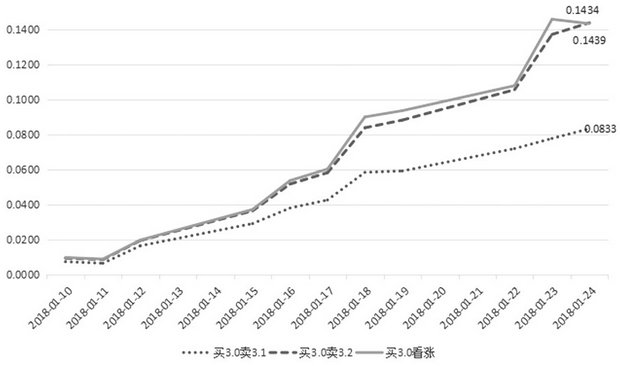 与卖出认购类似,卖出认沽在点位的选择上也是尽可能贴近研判的支撑位,在安全区间里选择行权价较高档位的认沽期权,以获取更多的权利金收益。在上述案例中,如果分别卖出行权价是2.8元和2.7元的认沽期权,持有至到期时,行情持续上行,并没有跌破下方各个支撑位,此时卖出2.8元的认沽期权可以获得11元/手的收益,卖出2.7元的认沽期权只能获取4元/手的收益。因此在上涨趋势中,顺势做卖出认沽期权的操作,可考虑更偏平值的合约以获得更大的策略收益。