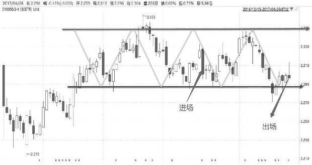 存在如下图所示一段行情, 50ETF在经历前期一波大幅回落之后,进入整理阶段,维持长时间的区间宽幅振荡,压力位为2.35元,支撑位为2.30元,无明显上涨或下跌趋势。那怎样才可以在没有趋势的振荡行情里利用期权获利呢?