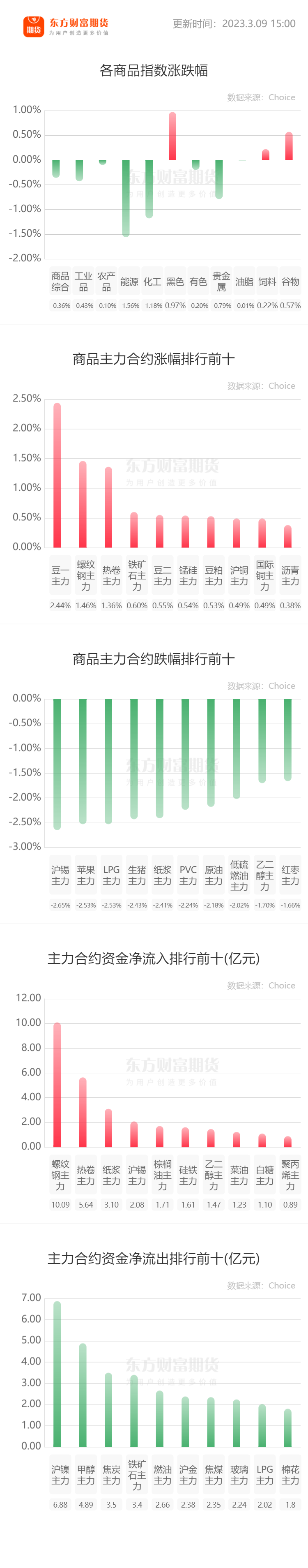 ![]() 二、宏观要闻 2023年2月份,全国居民消费价格同比上涨1.0%。其中,城市上涨1.0%,农村上涨1.0%;食品价格上涨2.6%,非食品价格上涨0.6%;消费品价格上涨1.2%,服务价格上涨0.6%。1--—2月平均,全国居民消费价格比上年同期上涨1.5%。2月份,全国工业生产者出厂价格同比下降1.4%,环比持平;工业生产者购进价格同比下降0.5%,环比下降0.2%。1—2月平均,工业生产者出厂价格比去年同期下降1.1%,工业生产者购进价格下降0.2%。(国家统计局) 昨夜21:15,美国1月ADP就业人数录得增加24.2万人,高于预期的增加20万人,前值从10.6万人上修到11.9万人。数据公布后,美联储巴尔金发表讲话称:“高通胀意味着美联储仍有工作要做。劳动力市场一直具有韧性。”(期货日报) 三、品种资讯 【农副类】 农作物:气象监测显示,过去10天,我国大部地区气温较常年同期明显偏高,其中内蒙古中东部、吉林、黑龙江及山东北部等地偏高6℃以上。中央气象台首席预报员方翀说,近期全国大部偏暖的格局对农业生产总体利大于弊。“近10天全国冬麦区、油菜产区以及华南春播区大部地区气温偏高2℃至6℃,初春季节有这样充足的热量条件,对北方冬小麦返青、南方油菜的生长以及华南早稻播种育秧都是明显有利的。”他说,气温偏暖还有利于蔬菜和经济林果生长速度加快、设施农业和畜牧业节约能源使用成本等。(新华社) 生猪:据农业农村部监测,2023年2月27日—3月5日,全国规模以上生猪定点屠宰企业生猪平均收购价格为16.59元/公斤,较前一周上涨1.3%,较去年同期上涨17.8%。白条肉平均出厂价格为21.87元/公斤,较前一周上涨1.0%,较去年同期上涨15.5%。(农业农村部) 大豆: 据中储粮集团官网消息,按照国家有关部门安排,中储粮集团公司于近日在黑龙江、内蒙古两个大豆主产区启动新增2022年产国产大豆收购计划。具体收购价格、库点等相关信息将及时通过所在地媒体分批向社会公布。中储粮集团公司及所属相关企业将按照相关规定做好国产大豆收购工作。(证券时报) 美国农业部在其最新月度供需报告中称,阿根廷今年大豆产量预计为3300万吨,这比2月份的预估大幅下调了20%,预计将创下2009年以来最低的产量纪录。美国农业部还估计,阿根廷的玉米产量为4000万吨,较一个月前的4700万吨大幅下调,同时这一预期也低于分析师平均预期的4350万吨。(财联社) 美国农业部数据显示,3月美国2022/2023年度大豆产量预期为42.76亿蒲式耳,2023年2月月报预期为42.76亿蒲式耳。3月美国2022/2023年度大豆期末库存预期为2.1亿蒲式耳,市场预期为2.20亿蒲式耳,2023年2月月报预期为2.25亿蒲式耳。3月美国2022/2023年度大豆单产预期为49.5蒲式耳/英亩,2023年2月月报预期为49.5蒲式耳/英亩。将阿根廷2022/2023年度大豆产量预期从此前的4100万吨下调至3300万吨(市场预期为3665万吨)。(财联社) 【能化类】 原油: 据相关文件显示,美国总统拜登的预算案将取消石油和天然气的税收补贴;预算案将集中更多资源用于追查与政府项目有关的欺诈行为;预算案将增加对违反劳动法的处罚。(财联社) 科威特石油公司CEO表示,成品油需求超预期强劲,尤其是在美国与欧洲市场;科威特在原油市场的份额并未被俄罗斯竞争者所挤占;暂时没有迹象显示OPEC会调整产能;公司炼油能力可以超出预期的每日61.5万桶水平。(财联社) 巴西石油CEO表示,受巴西政府开征石油出口税影响,公司可能减少原油的出口。(财联社) 据相关计划显示,阿塞拜疆计划4月BTC原油装载量为61.4万桶/日。(财联社) 国家统计局数据显示,2月,从环比看,PPI由上月下降0.4%转为持平。其中,生产资料价格由下降0.5%转为上涨0.1%;生活资料价格下降0.3%,降幅与上月相同。输入性因素推动国内石油相关行业价格上行,其中石油和天然气开采业价格上涨1.7%,石油煤炭及其他燃料加工业价格上涨0.6%。金属相关行业市场预期向好、需求有所恢复,黑色金属冶炼和压延加工业价格上涨1.7%,有色金属冶炼和压延加工业价格上涨1.0%。煤炭生产稳定,加之气温回升采暖用煤需求减少,煤炭开采和洗选业价格下降2.2%,降幅比上月扩大1.7个百分点。此外,计算机通信和其他电子设备制造业价格下降1.1%,农副食品加工业价格下降0.3%,纺织业价格下降0.3%,降幅均收窄。(国家统计局) 乙二醇:截至3月9日,华东主港地区MEG港口库存总量103.05万吨,较上一统计周期降低0.61万吨。近期主港虽发货平平但到货一般,库存微量回落。其中张家港53.4万吨,太仓18.45万吨,宁波9.5万吨,江阴及常州12.3万吨,上海及常熟9.4万吨。发货方面:张家港日均发货2500吨;太仓两库综合日均发货6200吨;宁波地区日均发货在3000吨左右。(隆众资讯) 沥青:最新数据显示,截至3月8日当周,国内沥青76家样本企业产能利用率为32.8%,环比增加0.9个百分点。分析原因主要是华东地区个别炼厂复产沥青,带动整体产能利用率上涨。产能利用率下降企业6家,较上周减少3家,产能利用率上升企业为7家,较上周持平。综合来看,全国范围内山东地区开工率依然最高,东北地区开工率垫底。山东地区开工率为48.7%,环比减少4.2%,东北地区开工率为8.9%,环比持平。 纸浆:截止2023年3月9日,中国纸浆主流港口样本库存量:207.3万吨,较上期下降2.2万吨,环比下降1.1%,库存量在连续两周期去库后继续呈现去库的状态。本周期纸浆国内主流港口青岛港库存再次呈现去库的情况,港上出货速度较上周期变化有限,到港