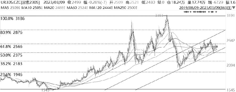 2022年5月初,尿素期货创出上市以来3191元/吨的高点之后,开启了单边下挫的走势,价格跌至黄金分割0.236对应的1950元/吨的支撑位才止跌企稳。之后,尿素期货价格呈现振荡上行的走势,近期价格回调至黄金分割0.5对应的2375元/吨的支撑位后止跌反弹。尿素期货长期均线和短期均线交织,整体走势没有明显的趋势性。MACD指标、KDJ指标、RSI指标反复交织,有钝化的迹象。综合来看,尿素期货处于振荡上行的走势之中,但是均线交织、指标钝化、量能有限,价格短期波动的幅度有限,或将呈现振荡走势。(金石期货 陈志翔) (责任编辑:admin) |
