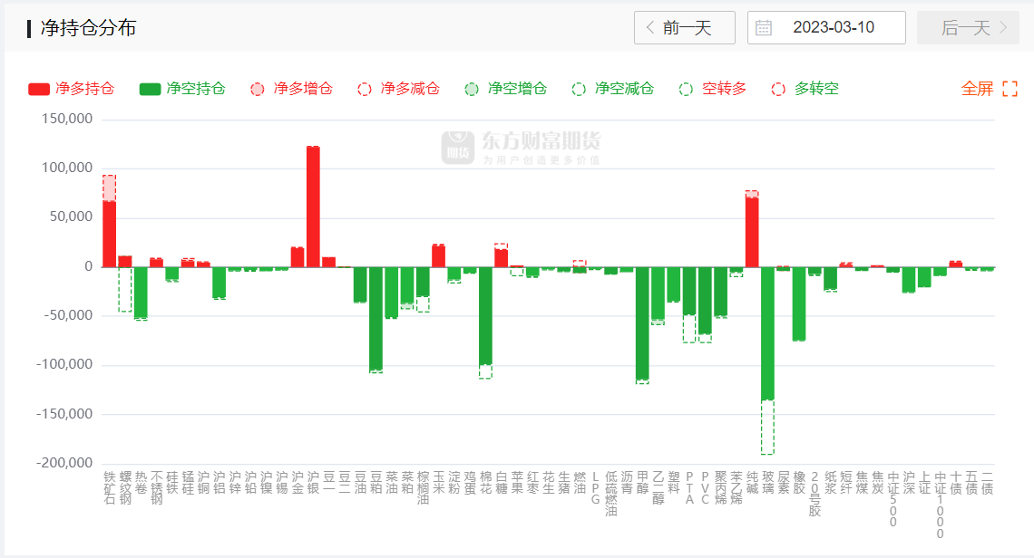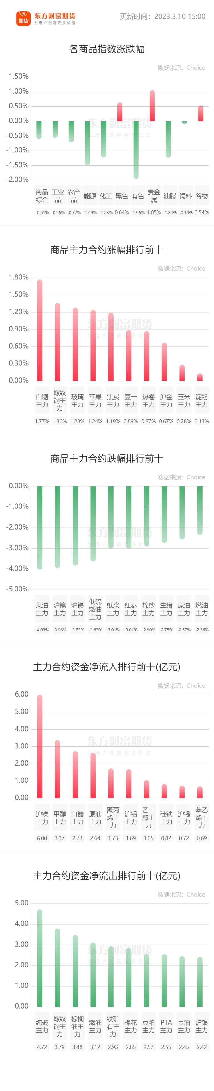 一、行情纵览 二、宏观要闻 在市场上有关美国经济“软着陆”甚至“不着陆”的猜测越来越多之际,实体经济释放的信号却指向:美国经济可能走向衰退。根据加拿大物流公司DescartesSystemsGroup的一份新报告,美国海运集装箱进口量在今年前两个月下降了20%。今年1月和2月,以20英尺当量单位计算的美国进口集装箱总量为380万个,比2022年同期的478万个有所减少。(财联社) 中指研究院监测,2023年2月房地产企业非银融资总额为448.5亿元,同比下降0.44%,环比下降15.5%。行业平均利率为4.46%,同比上升0.03个百分点,环比上升0.01个百分点。从融资结构来看,2月信用债规模占比74.1%,海外债占比4.6%,信托占比8.8%,ABS融资占比12.5%。(证券时报·e公司) 三、品种资讯 【农副类】 玉米:阿根廷是全球最大的加工大豆出口国和第三大玉米出口国,目前其正在遭受60多年以来最严重的干旱。阿根廷布宜诺斯艾利斯谷物交易所周四再次下调大豆产出预测,从3350万吨下降至2900万吨。此前罗萨里奥交易所已经将阿根廷大豆产量下调至2700万吨,这一预测也代表着本世纪以来阿根廷大豆产量的最低水平。(财联社) 豆粕:虽然豆粕等原料价格近期有所下跌,但实际上仍处于近年来的高位,下游饲料企业利润空间还是处于压缩状态。有业内人士告诉记者,“由于利润空间受到压缩,大型饲料企业竞争也进一步加剧,不断大手笔争夺市场占有率。”(财联社) 鸡蛋:财联社记者多方采访获悉,黄羽鸡价持续低迷主要是因为市场消费端欠佳。虽然中途有小幅上涨,主要是由于头部企业以及屠宰企业的拉动,持续性不足。业内人士认为,进入3月下旬,黄羽鸡价或迎来拐点,随后二、三季度有望持续上涨。(财联社) 粮食:3月10日,俄罗斯卫星通讯社消息,俄罗斯外交部发言人扎哈罗娃表示,俄罗斯和联合国代表计划于3月13日在日内瓦举行粮食磋商。(界面新闻) 菜籽油:中储粮网3月10日油脂公司菜籽油购销双向竞价交易结果:计划数量12738吨,成交数量1900吨,成交率15%。(中储粮网) 棉花:2023年2月底,中国棉花协会棉农分会对全国10个省市及新疆自治区进行了棉花交售进度情况的调查。调查结果显示:本月棉花交售数量较少,交售价格与上期基本持平。按照被调查农户产量及交售量计算,截至2月28日,全国棉花交售进度为99.1%,同比慢0.4个百分点;平均交售价格为7.4元/公斤,同比下跌17.8%,环比下跌0.4%。(中国棉花协会) 棕榈油: 据船运调查机构ITS数据显示,马来西亚3月1-10日棕榈油出口量为501514吨,上月同期为345080吨,环比增加45.33%。 马来西亚棕榈油局MPOB: 马来西亚2023年2月棕榈油库存为212万吨,环比减少6.56%,低于预期。彭博预期为223万吨,路透预期为220.6万吨。 马来西亚2023年2月棕榈油产量为125万吨,环比减少9.35%,低于预期。彭博预期为128万吨,路透预期为126.1万吨。 马来西亚2023年2月棕榈油出口为111万吨,环比减少1.99%,低于预期。彭博预期为114万吨,路透预期为113.9万吨。 马来西亚2023年2月棕榈油进口为52446吨,环比减少63.81%,低于预期。彭博预期为9万吨,路透预期为8.6万吨。 【能化类】 原油: 据路透社昨日最新报道,当地时间周三,由美国参议院司法委员会两党成员组成的一个小组重新提出“NOPEC”(《禁止石油生产和出口卡特尔法案》),允许联邦政府采取行动反对欧佩克操纵石油价格,以促进全球石油市场的公平和稳定。(期货日报) 欧佩克誓言将坚守其产量计划,因全球需求和俄罗斯供应前景存在不确定性,此举为全球油价设定了底线。在七国集团及其盟友将俄罗斯海运原油出口价格设定60美元/桶的上限后,俄罗斯计划在3月份减产50万桶/日。然而,欧佩克仍未有提高产量的意愿,安哥拉石油部长周三表示,欧佩克没有必要增加石油产量来弥补俄罗斯的减产。(期货日报) 美国页岩油巨头先锋自然资源公司(Pioneer Natural Resources)首席执行长谢菲尔德(Scott Sheffield)本周在得克萨斯州举办的CERAWeek能源会议上指出,油价已经触底,到夏季可能会飙升17%。(财联社) 据美国广播公司3月9日报道,美国和加拿大之间的大型输油管道“拱心石”(Keystone)由于石油泄漏问题频发,被美国交通部辖下的美国管道和危险材料安全管理局勒令限流运营。被限流的运输管道长度接近管道总里程的一半,达1931千米(1200英里)。(央视新闻) 当地时间9日,国际能源署署长比罗尔警告称,欧盟未来能源价格将显著上涨,廉价天然气将不复存在。(央视新闻) 联合国开发计划署当地时间3月9日宣布当天与Euronav公司签约,获得了一艘大型原油运输船,计划使用该艘船只对也门附近海域“萨菲尔”号油轮的原油进行转运。据了解,原油转运工作将会在船只准备好后进行。预计具体行动时间为今年5月。根据预估,仅清理原油就将会耗费大约200亿美元。联合国开发计划署署长施泰纳表示,“安全从‘萨菲尔’号移除原油是一项非常具有挑战性和复杂的行动。”目前联合国筹集到9500万美元,总预算为1.29亿美元。(财联社) 苯乙烯:截至3月9日当周,国内苯乙烯工厂开工率周平均66.88%,环比涨0.88%。(隆众资讯) 液化气:截至2023年3月9日当周,中国液化气港口样本库存量为170.67万吨,较上期(20230302)增加0.75万吨或0.44%。本周国内港口到船不及上周,华东及山东地区到船较上周增加,其他地区到船下降。气温回升,下游多采购相对便宜的炼厂气,对进口气需求下滑,本周中国液化气港口样本库存量小幅提升