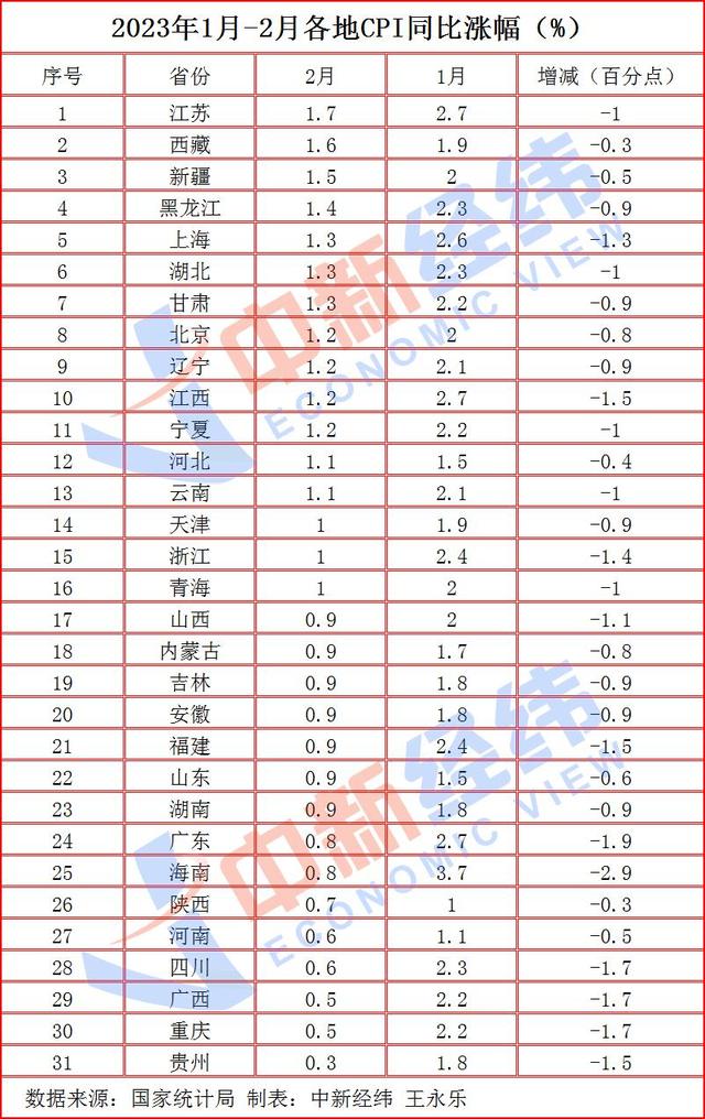 31省份2月CPI揭晓:15地重回“0时代” 有你家乡吗
