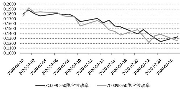 图为动力煤9月合约执行价550元看涨和看跌期权的隐含波动率