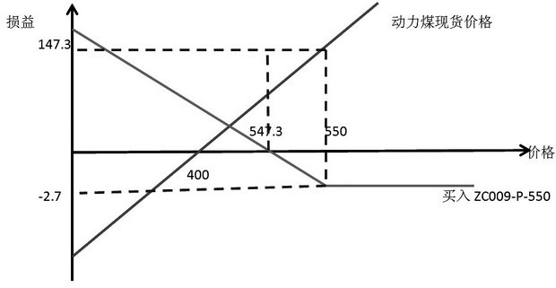 对于煤矿企业而言,担忧煤价下跌,影响销售收入,可以买入实值动力煤看跌期权,即执行价为550元/吨的2009期权合约,损益表如下。