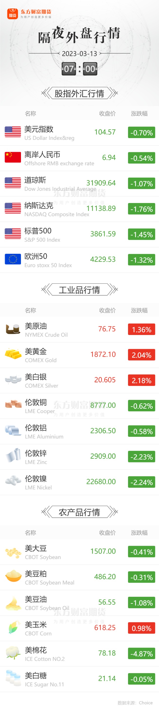 外盘收报![]() 每日精选浦发硅谷银行紧急回应!破产风暴直击硅谷最黑暗一天?世界首富要出手? 中储粮提价,不限蛋白含量收购国产大豆 业内:这释放了一个积极信号 ICE原糖创6年新高!除了减产 还有啥? 宏观产经中国证券报:中国人民银行3月10日公布数据显示,2月人民币贷款增加1.81万亿元,同比多增5928亿元;2月社会融资规模增量为3.16万亿元,比上年同期多1.95万亿元。在1月新增人民币贷款创下4.9万亿元的单月历史新高后,2月信贷延续了多增势头,新增社融同样超出预期。专家认为,整体看,春节过后企业复工复产提速,资金需求持续回暖,带动2月金融数据明显走强。 央视新闻:当地时间3月10日,根据美国联邦存款保险公司(FDIC)发布的一份声明,美国加州金融保护和创新部(DFPI)当日宣布关闭美国硅谷银行,并任命FDIC为破产管理人。为保护投保的储户,美国联邦存款保险公司创建了存款保险国家银行(DINB),硅谷银行在关闭时,作为接管人的联邦存款保险公司需立即将硅谷银行所有受保存款转移到DINB。 财联社:美国2月季调后非农就业人数为31.1万人(预期20.5万人),失业率3.6%(预期3.4%);市场颇为关心的平均小时工资年率为4.6%(预期4.7%)。同时去年12月和今年1月的非农就业数据分别下修2.1万和1.3万,至23.9万和50.4万。失业率的上升也与劳动参与率,特别是25-54岁人口的劳动参与率恢复到疫情前水平有关。当然,就业市场的过热仍旧有迹可循,1月职位空缺数据仍高达1080万个,差不多是未就业求职者的一倍,也远高于疫情前水平。对此美联储主席鲍威尔曾评论称,劳动力市场的紧张可能与结构性失业有关。 品种资讯黑色系&有色系期货 螺纹钢:上周,247家钢厂高炉开工率82.00%,环比上周增加0.93%,同比去年增加11.15%;高炉炼铁产能利用率88.03%,环比增加0.89%,同比增加8.26%;钢厂盈利率49.35%,环比增加6.49%,同比下降34.20%。(Mysteel) 3月10日,全国174家长、短流程代表钢厂废钢库存总量438.75万吨,较昨日增1.46万吨,增0.33%;库存周转天10.6天,较昨日增0.1天;日消耗总量38.94万吨,较昨日增0.38%;日到货总量40.39万吨,较昨日降1.79%。(Mysteel) 铁矿石:记者注意到,国家发展改革委等监管部门已多次提醒警惕“市场炒作”,并且今年以来已经四次“打铁”。特别是近日,针对铁矿石价格过快上涨情况,国家发展改革委价格监测中心组织部分市场机构和业内专家召开会议,分析研判铁矿石市场和价格形势,提出政策建议。对此,有行业权威人士向记者表示,这是一个重磅信号。(上海证券报) 上周,Mysteel统计全国钢厂进口铁矿石库存总量为9257.73万吨,环比增加4.17万吨;当前样本钢厂的进口矿日耗为287.65万吨,环比增加1.80万吨,库存消费比32.18,环比减少0.19天。(Mysteel) 据马钢股份公告,随着期货价格对现货市场的影响进一步深化,公司计划遵循套期保值的原则开展期货交易,2023年度套保最大规模为铁矿石240万吨、炼焦煤60万吨、焦炭48万吨、锰硅4万吨、硅铁2万吨、动力煤20万吨、螺纹钢60万吨、热轧卷60万吨。(界面新闻) 煤炭:经济形势预期回暖,项目开工建设增多,高炉开工率、铁水产量持续上升,运输需求加快释放,货盘增多,同时海况不佳,船舶周转率下降,沿海煤炭运价继续上行。(上海航运交易所) 有色:本周铜库存减少26008吨,铝库存增加8289吨,锌库存增加218吨,铅库存增加1969吨,镍库存增加1461吨,锡库存减少48吨,天然橡胶库存减少10吨。(上期所) 铝:近日,云南省再现大规模限电,这是继去年9月两轮限电后的第三次大规模限电,包括电解铝、黄磷、锌炼厂等一些企业都收到了限电通知。3月9日,《每日经济新闻》记者以投资者身份拨打国内电解铝企业云铝股份(SZ000807,股价12.84元,市值445.29亿元)公开电话,相关工作人员对记者表示,限电从去年9月份开始,现在一季度是枯水期,云南今年的来雨又少。今年2月份又进一步限电。(每日经济新闻) 工业硅:本周国内工业硅价格整体弱势运行。其中,冶金级下跌200-300元/吨,主流价格在17100-17900元/吨;化学级下跌200元/吨,主流价格在18500-18800元/吨。同时,铝合金ADC12价格下跌300/吨,主流报价19100元/吨;有机硅DMC价格下跌100元/吨,主流报价17500元/吨。本周工业硅成交订单偏少,市场情绪较为消极,工业硅各牌号价格小幅下行。(中国有色金属工业协会工业分会) 农产品期货 白糖:郑商所公告,自2023年3月15日结算时起,白糖期货2305合约的交易保证金标准调整为10%,涨跌停板幅度调整为8%。(财联社) 棕榈油:马来西亚2023年2月棕榈油库存为212万吨,环比减少6.56%,低于预期。马来西亚2023年2月棕榈油产量为125万吨,环比减少9.35%,低于预期。马来西亚2023年2月棕榈油出口为111万吨,环比减少1.99%,低于预期。彭博预期为114万吨,路透预期为113.9万吨。马来西亚2023年2月棕榈油进口为52446吨,环比减少63.81%,低于预期。(马来西亚棕榈油局MPOB) 据马来西亚独立检验机构AmSpec,马来西亚3月1—10日棕榈油出口量为474830吨,较上月同期出口的312092吨增加52.14%。(新华财经) 据船运调查机构ITS数据显示,马来西亚3月1-10日棕榈油出口量为501514吨,上月同期为345080吨,环比增加45.33%。(新华财经) 大豆:为落实2023年中央一号文件精神,发挥期货市场在服务乡村振兴战略等方面的积极作用,大连商品交易所决定2023年继续推进“农民收入保障计划”,并推出“银期保”大豆专项项目,目的是助力大豆扩种。(新华社) 黑龙江龙联农民专业合作社联社