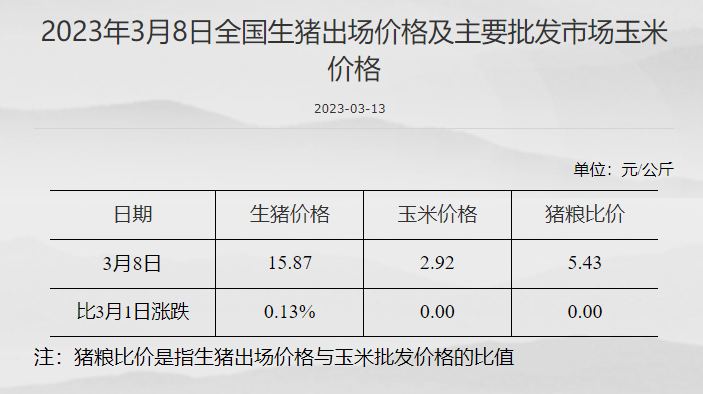 发改委:截至3月8日猪粮比价为5.43 比3月1日持平 发改委网站 03月13日 据国家发改委数据,截至3月8日,全国生猪出场价格为15.87元/公斤,比3月1日上涨0.13%;主要批发市场玉米价格为2.92元/公斤,较3月1日持平;猪粮比价为5.43,比3月1日持平。(文章来源:发改委网站) (责任编辑:admin)