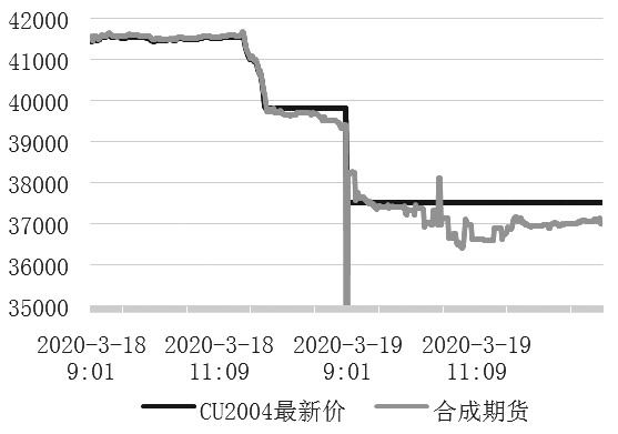 例如,在3月18日,沪铜(CU)2004合约出现了跌停板,但是合成期货并没有止步于当日的跌停板价。从上图可以看出,当3月18日CU2004跌停板之后,计算出的合成期货价格位于跌停板的下方。也就是说,市场认为CU2004并没有跌到位,下方仍然有空间。果然在3月19日,继续下跌,出现了另外一个跌停板。