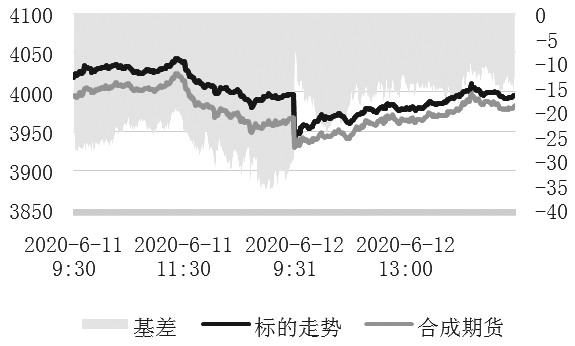 但6月12日沪深300期指收红,开盘价就是当日的最低点。从合成期货上来看,6月11日合成期货贴水在-30左右。但在6月12日开盘时,合成期货贴水突然缩小,从-30收敛到-7,最低的时候为-4左右。合成基差大幅收敛,说明合成期货跌幅没有标的深。