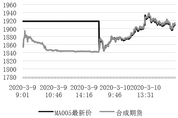 CU2004并不是一个孤例,在3月10日的甲醇(MA)005合约开盘就封在跌停板价位上,但是合成期货价格并没有停留在跌停板,而是在跌停板的下方,表明市场预期的价位要比跌停板还要低。从3月9日的走势来看,合成期货相对于MA005合约的贴水还比较低,但是随着时间推移,贴水越来越大。到3月10日,MA005低开,但是低开的位置基本就在合成期货3月9日收盘位置的附近。这表示3月9日合成期货的收盘价就是短期市场认定的合理价位。如果MA005到达这个价格,而且合成期货基差收敛到0附近,市场就认为短期已经跌到位了,可以尝试日内做多。