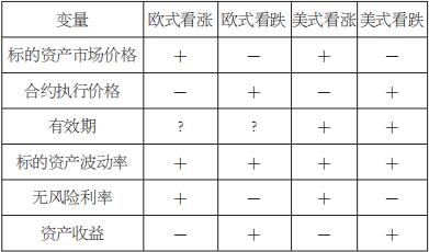 上表展示了各期权价格影响因素变化对期权价值的影响作用。在保证其他变量不变的条件下,看涨期权的价值与标的资产价格成正比,看跌期权的价值与标的资产价格成反比;看涨期权和看跌期权的价值都与合约有效期成正相关关系;看涨期权价值与无风险利率变化呈正相关关系,看跌期权价值与利率变化呈负相关关系;期权的价值与波动率的变动呈正相关关系。可见,这些因素变动都会给做市商带来持仓风险,做市商必须对冲这些风险。