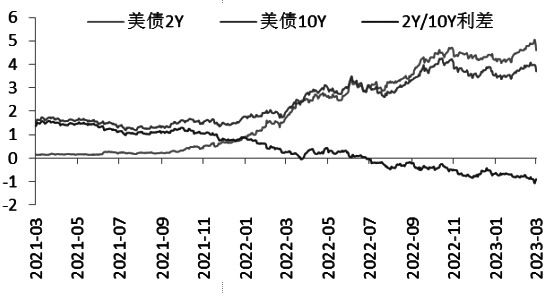 图为美国国债期限利差 我们认为硅谷银行破产主要反映了流动性风险而不是美国宏观基本面,在2月经济数据显示美国就业市场依然稳固的情况下,美联储应该坚持其加息计划,以免因暂停加息而引发更大的道德风险。但在硅谷银行破产导致市场心态不稳的背景下,美联储3月份加息50BP的现实阻力也在加大,加息25BP是更加可取的折中抉择,市场应该把重点放在美联储所公布的经济、通胀预测和利率点阵图上。