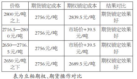 如果现货价格在2716.5元/吨之下,那么期权操作和期货操作相比,利润增加;如果现货价格在2716.5元/吨之上,期权操作和期货操作相比,利润减少。