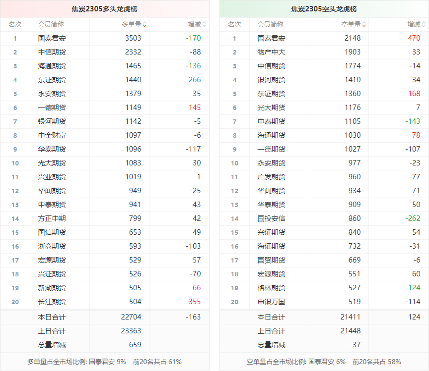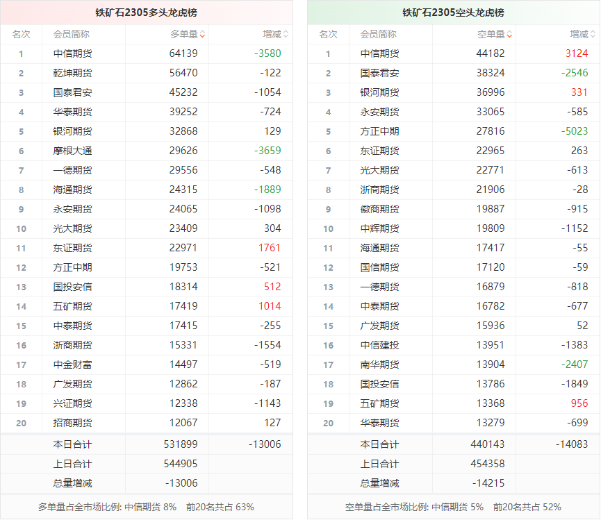 截至3月14日收盘,螺纹钢2305收4373/吨,涨0.51%;热卷2305收4467/吨,涨0.63%;铁矿石2305收920元/吨,跌0.22%;焦炭2305收2860.5/吨,跌1.94%;焦煤2305收1968元/吨,跌1.2%。 螺纹钢2305合约前20席位多单减仓29509手至121.8万余手,空单减仓51017手至121.2万余手。其中,国泰君安期货多单减持4553手,空单减持38046手,整体呈净空125099手。 各品种具体如下: ![]() (来源:东方财富期货PC端) 各品种持仓情况具体如下: ![]() ![]() ![]() ![]() ![]() (文章来源:东方财富研究中心) (责任编辑:admin) |
