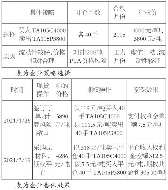 图为期权交易计划操作流程 1.签订订单:与下游厂家签订订单,完成订单需500吨PTA产品。 2.计算出需要用期权进行套保的现货端商品对应看涨期权的建仓数量:企业根据自身的敞口情况,以及考虑增值税等因素,企业需要对冲200吨PTA的价格风险,每张PTA期权的合约单位是5吨,则需要买入40张看涨期权,卖出40张看跌期权。 3.根据标的实时行情确定较佳的建仓时点:2021年1月份下旬,企业认为短期内PTA价格上涨概率较大,选择在1月26日进行领子组合的建仓操作。 4.确定建仓数量、建仓时点和行权价格后开仓看涨期权备兑仓位:1月26日PTA主力合约的收盘价为3890元/吨,该企业选择用行权价格为4000元/吨的5月份(到期日为4月6日)看涨期权合约和行权价格为3800元/吨的5月份(到期日为4月6日)看跌期权建立了40手领子期权组合。 5.企业采购原材料后,进行期权平仓操作:企业于3月19日采购现货,全部仓位在3月19日平仓。 组合期权套期保值效果显著