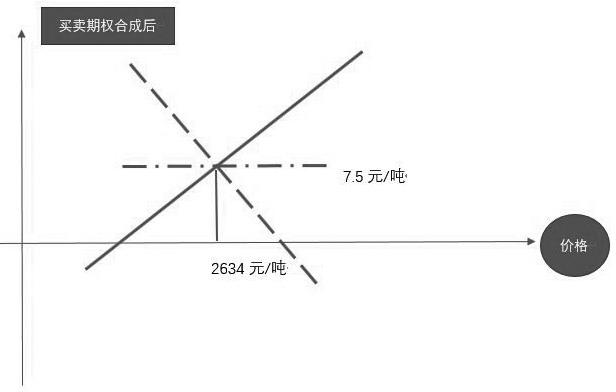 由于在2634元/吨的价位,该期权合成直线的损益为组合净时间价值之和:7.5元/吨,并且在该价位的期货合约多单的损益为0元/吨,因此该套利组合的损益点为7.5元/吨,故图表上可以将期货合约多单的损益直线上移7.5元/吨,这两条损益直线交叉于7.5元/吨,这个收益也就是套利组合的固定收益。
