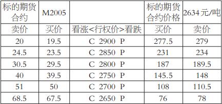 而这条反向损益直线,可以是期货单边持仓损益直线(期货多头持仓为45度线,期货空头持仓为135度线),也可以是另一条期权合成损益直线。下面我们以某日期货实盘行情举例说明,由于行情截图数字过密难以清楚显示,笔者将其中价格数据用表格列出,行情数据取值于时点为2020年2月4日14:06分,标的物为豆粕2005的期权合约报价,该时点M2005合约期货价格为2634元/吨。