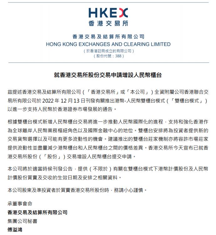港交所:已就香港交易所股份交易增设人民币柜台提交申请