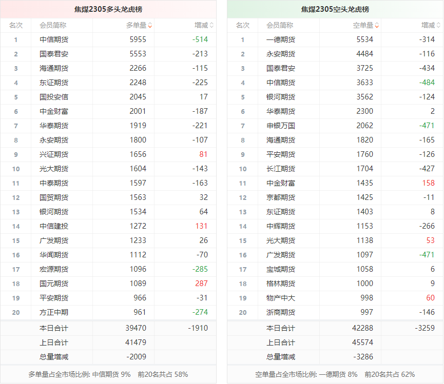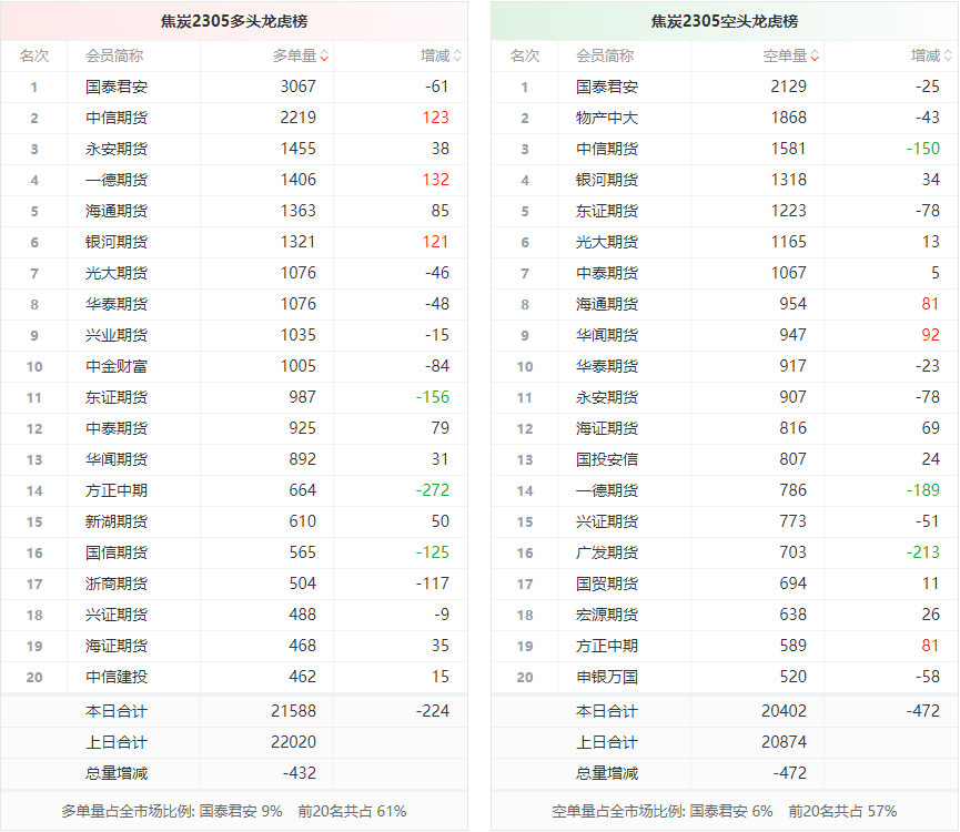 截至3月16日收盘,螺纹钢2305收4205/吨,跌3.53%;热卷2305收4310/吨,跌3.51%;铁矿石2305收902元/吨,跌2.8%;焦炭2305收2756.5/吨,跌3.04%;焦煤2305收1853.5元/吨,跌4.53%。 螺纹钢2305合约前20席位多单减仓70300手至105.9万余手,空单减仓74338手至105.3万余手。其中,中信期货多单减持26032手,空单减持8500手,整体呈净多110892手。 各品种具体如下: ![]() (来源:东方财富期货PC端) 各品种持仓情况具体如下: ![]() ![]() ![]() ![]() ![]() (文章来源:东方财富研究中心) (责任编辑:admin) |