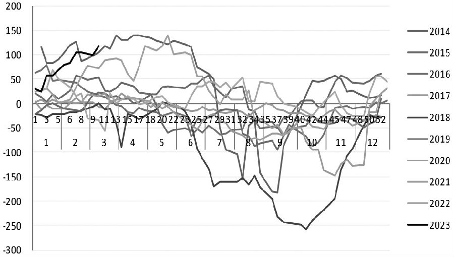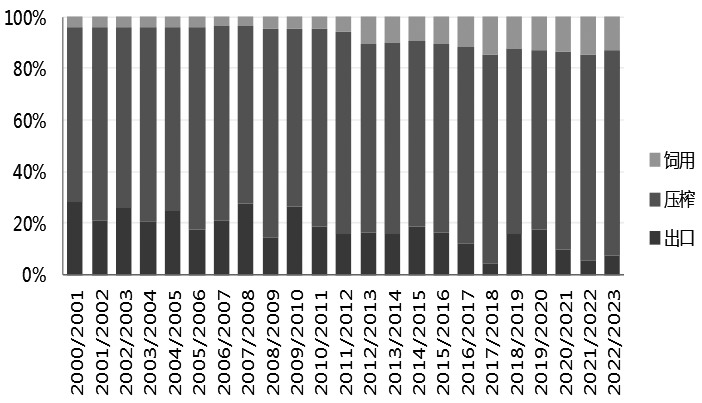 图为阿根廷大豆需求结构 C全球大豆供需改善不及预期 因阿根廷大豆产量大幅下降导致2022/2023年度全球大豆供需改善不及预期。以2023年3月USDA月报为标准,阿根廷大豆产量下调至3300万吨后,南美四国的总产量为1.98亿吨,同比2021/2022产季增加1729万吨,但较期初预估的2.1亿吨减少1540万吨,基本回到2020/2021产季水平。 阿根廷大豆大幅减产后拉低了全球大豆的供应水平。2022/2023年度全球大豆期末库存在1亿吨上下,同比增量仅100万吨,库销比维持19%,与前一年基本持平。即2022/2023年度全球大豆供需从期初预估的极大缓解逐渐调整至小幅改善。 D关注大豆市场短期交易重点 今年阿根廷大豆核心产区持续高温少雨造成产量大幅下调已经无法改变,这将在未来半年时间持续影响国际大豆市场。但阿根廷减产题材已经逐渐从交易因素转化为背景因素,对南美天气和阿根廷产量的交易已不是大豆短期价格波动的重心。 对于大豆市场,下一个交易主题应该是5月中旬以后对美国新作天气和生长形势的跟踪。而在这之前,3—4月,市场的关注点会放在巴西丰产确定且新豆收割上市以后对美豆出口销售的挤压上。预计在需求不足的情况下,未来1—2个月CBOT大豆近月合约走势偏弱,从目前1500美分/蒲式耳的振荡重心逐渐下移。 对中国市场来说,阿根廷大豆减产的直接影响相对较小,更多体现在对进口成本的抬升上。但是今年巴西1.5亿吨以上的绝对丰产以及9000万吨左右的出口预估足够保证中国的用豆需求,国际供应不再成为制约国内豆粕市场的因素。 正是基于此预估,叠加国内养殖需求疲弱,过去一个多月里,国内豆粕基差持续下跌,已经从春节后的700元/吨下跌至250元/吨附近(华南地区)。而二季度月均1000万吨的到港量或继续施压国内豆粕近月基差,0元/吨甚至负值基差并不遥远。但目前国内油厂对5月以后进口大豆买船进度偏慢,三季度进口大豆到港或存不确定性,阶段性对国内豆粕基差形成支撑,需持续关注产地贴水、进口榨利和油厂买船情况。(作者单位:中州期货) (责任编辑:admin) |