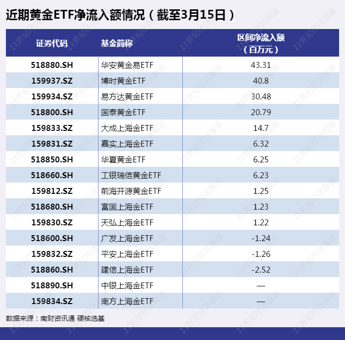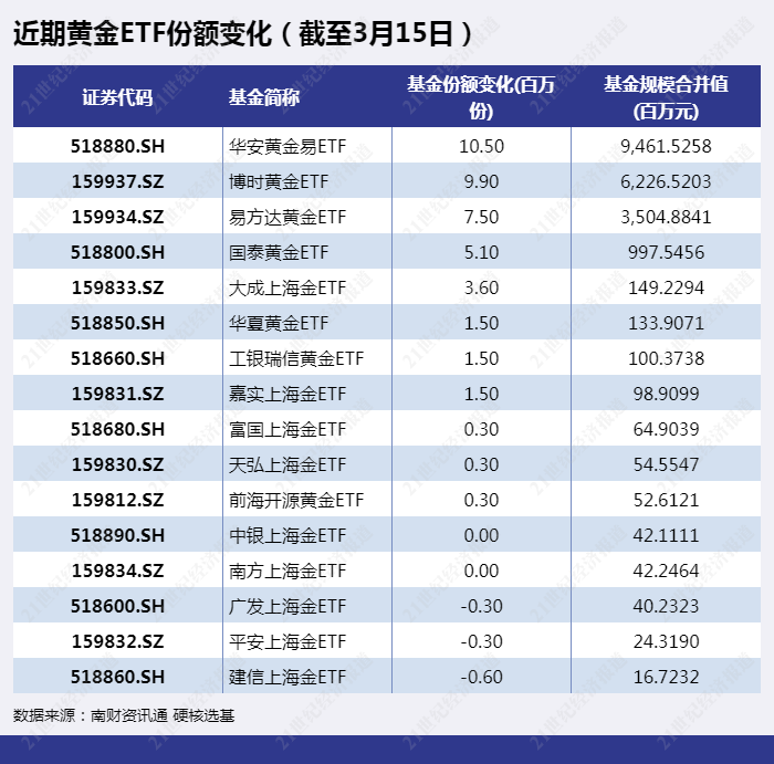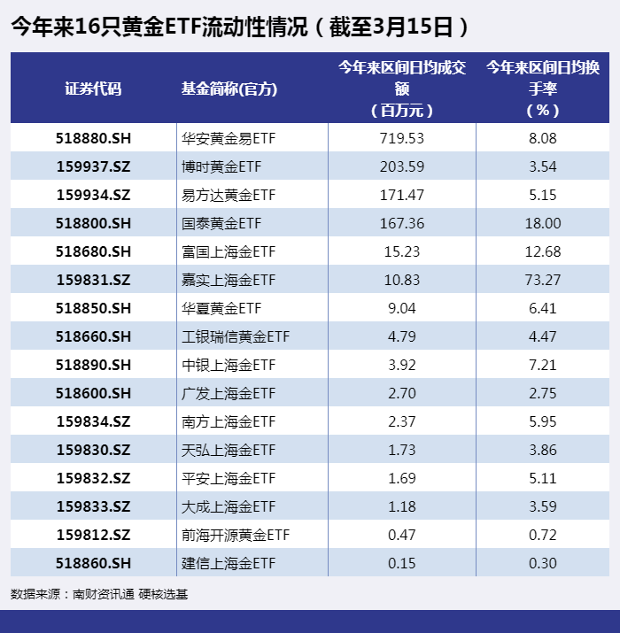 近期,硅谷银行破产事件影响蔓延,美元走软及美国国债收益率下降为避险资产带来提振,3月13日,国际金价站上1900美元/盎司。 就当硅谷银行事件影响逐渐弱化时,资本市场大风暴再次来袭。 此前最大股东沙特国家银行拒绝提供更多援助后,瑞信表示该行在2021年和2022年的财务报告内部控制方面发现了重大缺陷。当地时间3月15日,瑞士信贷银行开盘跌近30%。 瑞士信贷银行股价暴跌引发了市场对欧洲银行业风险释放的担忧,导致投资者转向黄金等避险资产。当天,国际金价创下今年2月1日来新高。 有意思的是,3月16日,瑞士信贷美股盘前涨超20%。消息称,瑞信将向瑞士央行借款至多500亿瑞郎,拟以约30亿瑞郎回购。 目前,市场对于黄金多空博弈激烈,美联储加息立场是否会软化成为市场最大的博弈焦点。 那么,黄金后续还值得买吗?市场上16只黄金ETF资金偏爱哪些?该如何选择? 资金偏爱哪些黄金ETF?马太效应凸显! 目前,市场上共有16只黄金ETF。 自当地时间3月10日硅谷银行破产事件以来,不少黄金ETF呈现了份额增加的情况。 ![]() 从统计来看,华安黄金易ETF(518880)3月13日以来(包括当天,下同)份额增长1050万份,同时基金规模以94.62亿元稳居第一。 其次是博时黄金ETF(159937)和易方达黄金ETF(159934)份额分别增加990万份和750万份,基金规模分别为62.27亿元和35.04亿元。 不过也有一些黄金ETF近期份额减少,比如广发上海金ETF(518600)、平安上海金(159832)和建信上海金ETF(518860)。而这三只基金也是16只黄金ETF中规模最小的。 规模越大的黄金ETF,截至3月15日,近3个交易日份额增加最多。 ![]() 同时,硬核选基梳理了截至3月15日,16只黄金ETF近3个交易日的净流入额。 其中华安黄金易(518880)3个交易日净流入额为4331万元,博时黄金ETF(159937)紧随其后,净流入额超4000万元。 不过,广发上海金(518600)、平安上海金ETF(159832)和建信上海金(518860)近3个交易日呈现净流出的情况。 16只ETF流动性如何? ETF业绩表现是一方面,另一方面作为场内交易型产品,ETF流动性至关重要。 硬核选基进一步整理上述16只ETF今年以来换手率、成交额等来判断ETF流动性。 ![]() 从日均成交额来看: 华安黄金易ETF(518880)、博时黄金ETF(159937)、易方达黄金ETF(159934)、国泰黄金ETF(518800)日均成交额均在亿元级,其中华安黄金易ETF(518880)日均成交额高达7.20亿元。 从换手率来看: 嘉实上海金ETF(159831)换手最为频繁,日均换手率高达73%。 国泰黄金ETF(518800)、富国上海金ETF(518680)换手率也较为频繁,均在10%以上。 黄金资产后续怎么看? 近期,外部事件层出不穷,美国重要数据接连发布,黄金多空博弈激烈。对于黄金,是否还值得买买买? 1、短期内避险需求尚在 ——3月10日,硅谷银行破产。事后,高盛预测3月不加息。