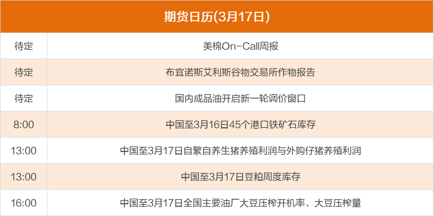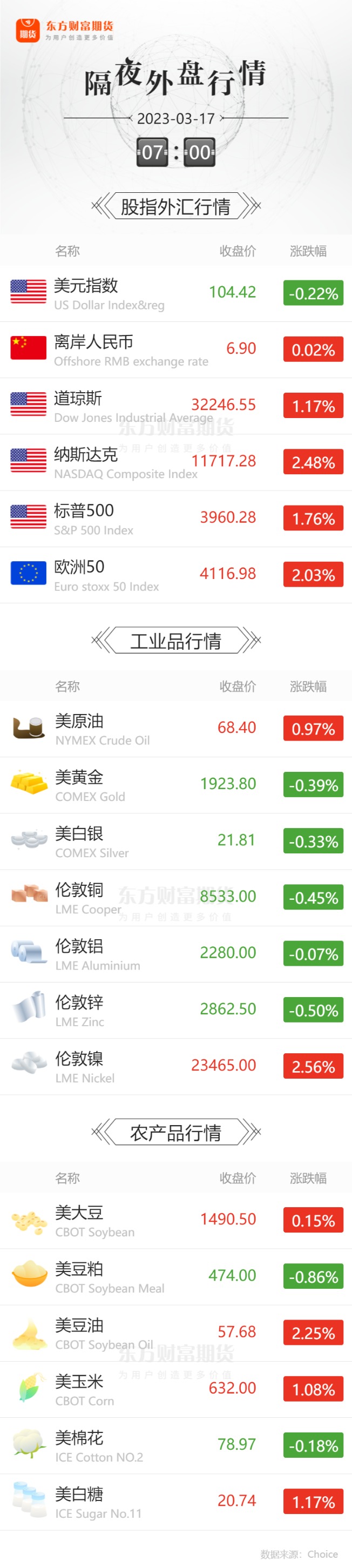 外盘收报![]() 每日精选国家推出稳定2023年大豆生产一揽子支持政策 商务部回应澳煤进口问题:中国对煤炭进口实行自动许可管理 最新房价数据出炉!70城总体上涨 上海二手房价领涨全国 宏观产经新华社:近日,中共中央、国务院印发了《党和国家机构改革方案》,并发出通知,要求各地区各部门结合实际认真贯彻落实。方案提出,组建中央金融委员会,加强党中央对金融工作的集中统一领导,负责金融稳定和发展的顶层设计、统筹协调、整体推进、督促落实,研究审议金融领域重大政策、重大问题等,作为党中央决策议事协调机构;组建中央金融工作委员会;组建中央科技委员会;组建中央社会工作部;组建中央港澳工作办公室。 国家统计局:2023年2月份,随着政策效果逐步显现及住房需求进一步释放,70个大中城市中商品住宅销售价格环比上涨城市个数继续增加,各线城市商品住宅销售价格环比总体上涨,一线城市商品住宅销售价格同比上涨、二三线城市同比降幅收窄。 界面新闻:欧洲央行将三大主要利率均上调50个基点,符合市场预期。三项主要利率中再融资利率升为3.50%,边际贷款利率为3.75%,存款利率为3.00%。自去年7月开启加息进程以来,欧洲央行已连续六次大幅加息以遏制通胀,共计加息350个基点。 品种资讯黑色系&有色系期货 螺纹钢:截至3月16日当周,螺纹产量连续七周增加,螺纹社库连续第三周减少,螺纹厂库连续第四周减少,螺纹表需由增转降。其中螺纹社库858.51万吨,较上周减少30.02万吨,降幅3.38%,螺纹表需350.13万吨,较上周减少6.72万吨,降幅1.88%。(Mysteel) 中西部钢材数据:截至3月15日,社库506.88万吨,较上周减少11.28万吨,下降2.18%;厂库283.69万吨,较上周减少10.99万吨,下降3.73%;产量168.10万吨,较上周增加2.28万吨上升1.37%。(钢谷网) 4月份钢厂订单压力尚可,不过值得注意的是,钢厂目前有利润支撑,因此对于品种结构会发生调整,市场流通资源或将有回升的空间。(Mysteel) 铁矿石:包钢股份在最新披露的投资者关系活动记录表中表示,中矿集团的成立属于国家战略,公司也加入了中矿集团,相信中矿集团的成立对进口铁矿石的规范运行有一定的好处。(第一财经) 煤炭:商务部回应关于澳煤通关全面放开问题时表示,中国对煤炭进口实行自动许可管理,煤炭自动进口许可证可正常申请。需要强调的是,中方依据世贸组织规则和中国法律法规管理对外贸易,将相关管理方式误读为限制措施是不合适的。(财联社) 有色:欧盟建议将铜、镍列为关键原材料。(财联社) 农产品期货 大豆:国家推出稳定2023年大豆生产一揽子支持政策。其中包括:完善玉米大豆生产者补贴政策,增加补贴总额,指导东北四省区合理确定玉米大豆补贴标准,调高大豆补贴标准,并着力加大高油高产大豆支持,促进稳定东北大豆生产。加快组织大豆收储,指导中储粮集团公司在黑龙江、内蒙古两个主产区新增国产大豆收购计划,加大收储力度,释放积极信号,发挥市场引导作用。(农业农村部) 2022/2023年美国大豆出口净销售为665000吨,前一周为-2.3万吨,明显高于前一周和前4周的平均水平;其中,对中国出口净销售208100吨,前一周为17.9万吨。2023/2024年出口净销售为66100吨,前一周为17.2万吨。(新华财经) 生猪:与以往月报相比,2月猪企月报“出炉”较晚,财联社记者不完全统计,目前公布2月出栏月报猪企尚未过半,已公布的猪企多数实现了单月出栏量同比及环比的增长。今年头部猪企和中小猪企发展侧重点不同,目前头部猪企扩张节奏放缓,已将目光投向全产业链发展,牧原股份(002714.SZ)多次加码新能源业务,近期傲农生物(603363.SH)宣布募资5亿投建屠宰厂和肉制品。(财联社) 3月16日“农产品批发价格200指数”为131.41,与昨天持平,“菜篮子”产品批发价格指数为133.70,比昨天上升0.02个点。截至16日14:00时,全国农产品批发市场猪肉平均价格为20.58元/公斤,比昨天下降0.3%;鸡蛋10.49元/公斤,比昨天上升0.8%。(农业农村部) 棕榈油:据南部半岛棕榈油压榨商协会(SPPOMA)数据显示,2023年3月1-15日马来西亚棕榈油单产减少29.06%,出油率减少0.19%,产量减少29.08%。(新华财经) 棉花:据记者了解,目前,新疆广大的地区迎来了棉花、小麦、玉米及大豆的备播季,由于农民们的市场风险意识、种植收入预算意识较强,因此,在新的农作物播种季,大家都在反复的掂量到底要种什么。内地棉农植棉积极性继续下降,如黄河流域和长江流域植棉意向面积同比分别下降17.8%和30.3%,较上期分别扩大6.6%和23.1%。(期货日报) 白糖:今日广西白糖现货成交价为6063元/吨,下跌77元/吨;产区制糖集团报价区间为6140~6310元/吨,加工糖厂主流报价区间为6220~6390元/吨,下调区间为20~60元/吨。期价大幅下挫,刺激部分基差商点价销售,成交较前几日稍好。(泛糖科技) 能化期货 原油:近期欧美银行业的恐慌情绪蔓延,严重打击了原油市场的情绪,国际油价在近三个交易日连续大幅下挫,刷新2021年12月份以来新低。市场观点认为,短期来看,在宏观利空仍占据主导的背景下,原油市场维持偏弱运行的概率较大,但悲观情绪释放后,油市供需面的积极因素或仍将支撑油价。(新华财经) 燃料油:新加坡企业发展局数据显示,截至3月15日当周,新加坡燃油库存增加92.1万桶,达到2109.2万桶的三周高点。新加坡中型馏分油库存增加554000桶至945.2万桶,为2021年11月以来的最高水平。新加坡轻质馏分油库存增加135.8
