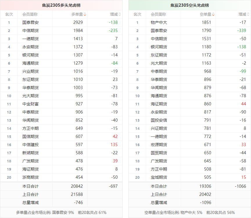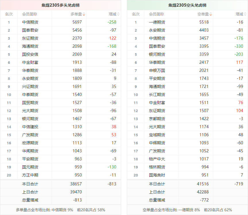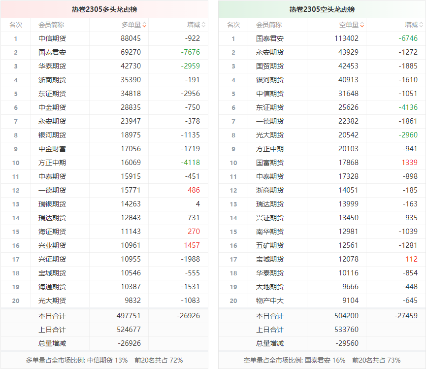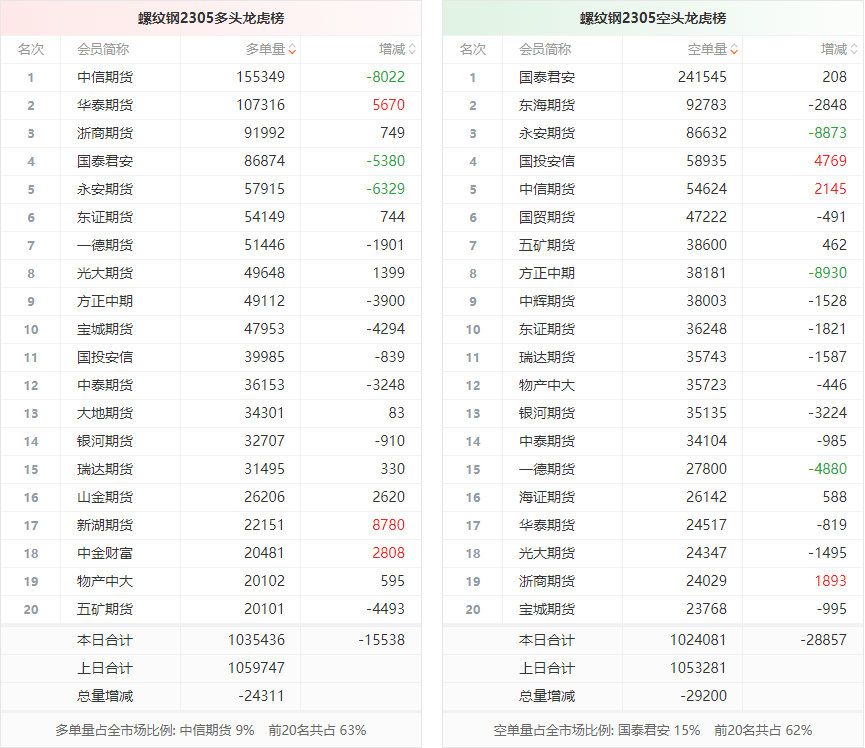 截至3月17日收盘,螺纹钢2305收4262/吨,涨0.16%;热卷2305收4359/吨,涨0.05%;铁矿石2305收915元/吨,涨0.44%;焦炭2305收2784.5/吨,跌0.04%;焦煤2305收1874.5元/吨,跌0.37%。 螺纹钢2305合约前20席位多单减仓15538手至103.5万余手,空单减仓28857手至102.4万余手。其中,方正中期期货多单减持3900手,空单减持8930手,整体呈净多10931手。 各品种具体如下: ![]() (来源:东方财富期货PC端) 各品种持仓情况具体如下: ![]() ![]() ![]() ![]() ![]() (文章来源:东方财富研究中心) (责任编辑:admin) |