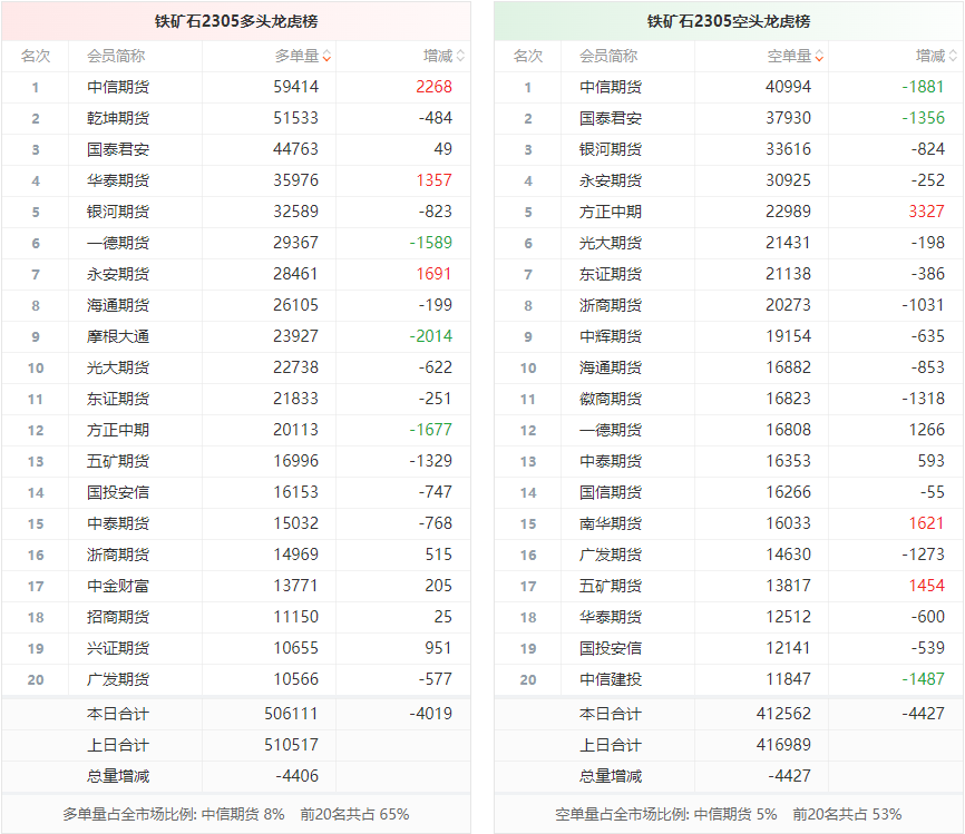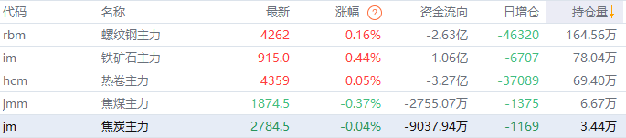 黑色持仓龙虎榜:铁矿石涨0.44% 方正中期期货减持近9千手螺纹空单