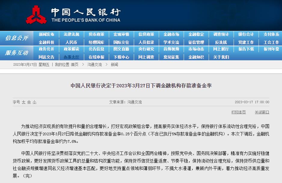 央行:3月27日下调存款准备金率0.25个百分点