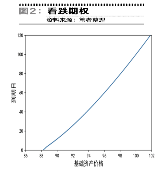 不但是看涨期权,对于看跌期权亦是如此。图2展示了为保持看跌期权价值不变,随着时间的流逝,基础资产价格所需达到的水平。可以看到,随着到期日的临近,基础资产价格必须下降才能保持看跌期权的价值不变,而且两者之间的关系也呈现出近似线性关系。在到期日,股票价格须为90-1.78=88.22元方能满足。