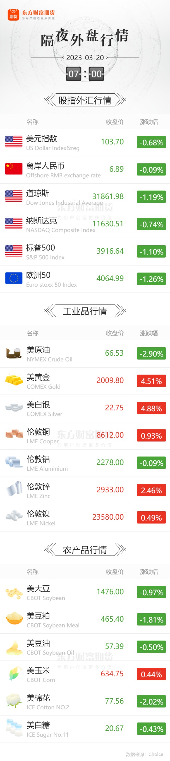 外盘收报![]() 每日精选央行降准基金公司解读:预计释放5000亿左右长期资金或利于拔估值延续 楼市回暖了吗?35城进入复苏通道东北区域房价仍呈下滑态势 瑞士金融监管部门推动瑞银集团收购瑞士信贷 中国结算:2月新增投资者数167.68万 环比增加98.48% 央行:为推动经济实现质的有效提升和量的合理增长,打好宏观政策组合拳,提高服务实体经济水平,保持银行体系流动性合理充裕,中国人民银行决定于2023年3月27日降低金融机构存款准备金率0.25个百分点(不含已执行5%存款准备金率的金融机构)。本次下调后,金融机构加权平均存款准备金率约为7.6%。 界面新闻:3月19日,据彭博报道,美国中型银行联盟(MBCA)在一封信件中要求联邦监管机构在接下来两年将联邦存款保险公司(FDIC)的保险扩大到所有存款。“这样做将可以立即止住较小银行存款外流的势头,稳定银行业,并大幅减少更多银行倒闭的风险。”美国中型银行联盟说,“尽管银行业整体健康、安全,但除了大型银行之外,其它银行的信心都遭到侵蚀,”该机构认为,如果继续发生银行倒闭,存款势将加速撤离。 财联社:经济合作暨发展组织(OECD)预期2023年中国增长5.3%,2024年增长4.9%(前次预估分别为4.6%和4.1%);预期2023年欧元区增长0.8%,2024年增长1.5%(前次预估分别为0.5%和1.4%);预期2023年日本增长1.4%,2024年增长1.1%(前次预估分别为1.8%和0.9%);OECD预期2023年英国萎缩0.2%,2024年增长0.9%(前次预估分别为萎缩0.4%和增长0.2%)。 品种资讯黑色系&有色系期货 铁矿: 花旗预计铁矿石价格将在2023年第二季度达到每吨120美元,在第三季度降至每吨100美元。(新华财经) 近日,国家发展改革委价格司会同有关方面赴青岛港、唐山港开展调研,了解港口铁矿石库存、堆存收费等有关情况,分析研判铁矿石市场和价格形势,研究做好铁矿石保供稳价工作。期间,调研组组织部分铁矿石贸易企业召开专题会议,提醒告诫铁矿石贸易企业依法合规经营,不得囤积居奇、哄抬价格。(发改委网站) 镍: 当地时间3月17日,LME宣布,其亚洲时段镍合约交易的恢复时间,将推迟一周至3月27日,原因为该所发现其仓库中的部分镍不符合合约规格。(界面新闻) 据《俄罗斯商业咨询》(RBC)3月18日报道,俄罗斯三种商品—镍、化肥和矿物燃料的出口呈现出一年来的最大增长。俄罗斯在2022年出口了价值58亿美元的镍和镍产品,比2021年增长了190%。化肥的出口额为193亿美元,增长54.3%。俄罗斯还出口了价值3837亿美元的矿物燃料,增长42.8%。2022年,降幅最大的是地面运输(41.5%),家具(32.2%)和贵金属(28.8%)。(界面新闻) 煤炭: 近日,山西省应急管理厅、国家矿山安全监察局山西局联合下发通知,自3月起至今年年底对山西省所有正常生产建设和2023年内复工复产的露天矿山开展安全生产专项整治。(财联社) 据中国电力企业联合会消息,根据电煤采购经理人调查统计结果计算,本期(3月9日至3月16日)CECI电煤采购经理人指数50.09%,环比下降0.86个百分点,处于50%的荣枯分界线以上,电煤市场整体处于扩张区间。(财联社) 金: 记者3月18日从山东省地矿局获悉,近日,山东乳山市崖子镇西涝口村探获一处大型金矿床,查明金金属量近50吨。据了解,该矿床由山东省地矿局第六地质大队勘查,3月18日已经山东省自然资源厅组织的专家储量评审通过。(央视新闻) 硅谷银行破产、瑞信暴雷引发全球金融风险担忧加剧,叠加美联储加息预期放缓,国际金价逼近2000美元/盎司关口。二级市场上,本周四川黄金、中润资源、银泰黄金、西部黄金、金一文化、曼卡龙等黄金概念股涨幅明显,其中,次新股四川黄金上市11日录得11板,本周涨幅超61%,上市以来涨超211%。(21世纪经济报道) 农产品期货 鸡蛋:日本多地近期持续暴发禽流感疫情导致大量蛋鸡被扑杀,该国鸡蛋价格不断飙升、供应短缺。受此影响,一些餐饮企业不得不停止供应蛋包饭、玉子烧等含蛋菜品。(上观新闻) 大豆:3月16日,中央农办协调推动农业农村部、国家发展改革委、财政部、国家粮食和储备局等部门,统筹考虑大豆市场供需形势、比较效益和农民种植意愿等因素,出台一揽子稳定大豆生产支持政策措施,形成补贴、保险、收储协同发力的一套政策“组合拳”,多措并举、综合施策,释放明确信号。(华夏时报) 农产品:当地时间18日,俄罗斯外交部发言人扎哈罗娃在接受俄媒采访时表示,俄罗斯决定将黑海港口农产品外运协议只延长60天。俄方已通过口头和照会形式将上述决定通知有关各方。(央视新闻) 棉花: 2022/23年度,受到疫情影响,新疆棉花测产、收购、加工、公检工作均受到不同程度影响,为掌握更加精准的全国棉花产量数据,国家棉花市场监测系统对全国棉花种植面积及产量再次调查,现对本年度全国棉花面积和产量数据进行更新,其中上调新疆棉花种植面积,产量调增至622.7万吨,内地棉花面积和产量均小幅调减,全国总产量调增至671.9万吨。(中国棉花网) 中国棉花协会17日发布棉纺织企业调查报告:2月中国纺织企业使用新疆棉和地产棉比例增加,使用进口棉比例减少。2月,中国纺织企业使用新疆棉占总用棉量的86.78%,较上月增加0.34个百分点,同比减少0.13个百分点。同期,中国纺织企业使用地产棉比重为4.77%,较上个月增加0.05个百分点。2月,中国纺织企业使用进口棉比重为8.45%,较上月减少0.39个百分点,同比减少0.58个百分点。 能化期货 原油: 芝商所(CME)下调WTI原