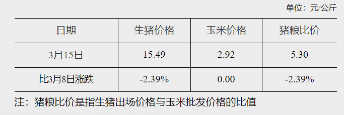 国家发改委:截至3月15日 全国猪粮比价周环比下跌2.39% 发改委网站 03月20日 据国家发改委,截至3月15日,全国生猪出场价格为15.49元/公斤,比3月8日下跌2.39%;主要批发市场玉米价格为2.92元/公斤,较3月8日持平;猪粮比价为5.30,比3月8日下跌2.39%。 2023年3月15日全国生猪出场价格及主要批发市场玉米价格(文章来源:发改委网站) (责任编辑:admin)