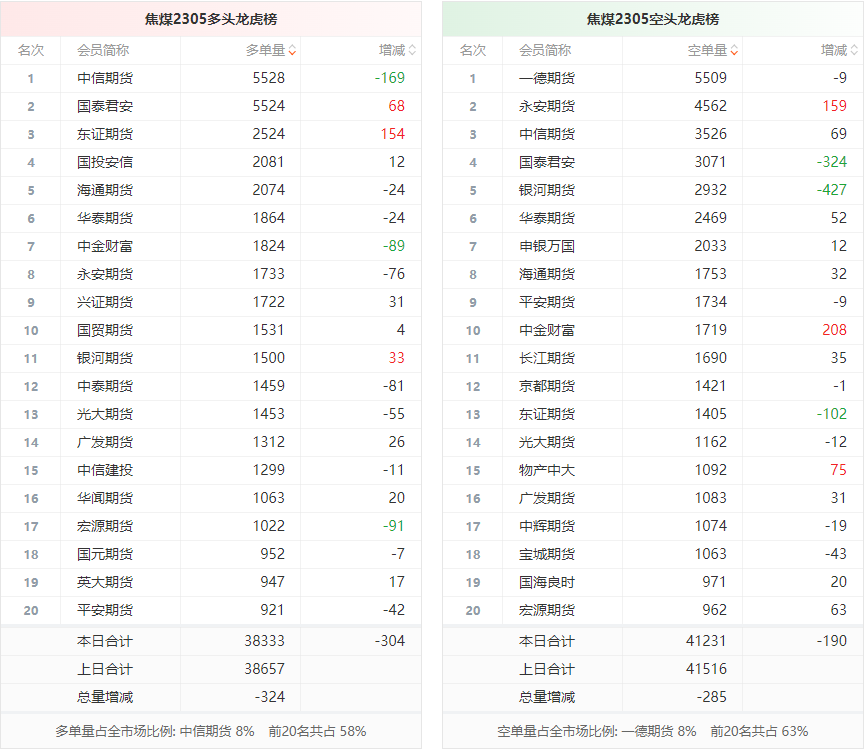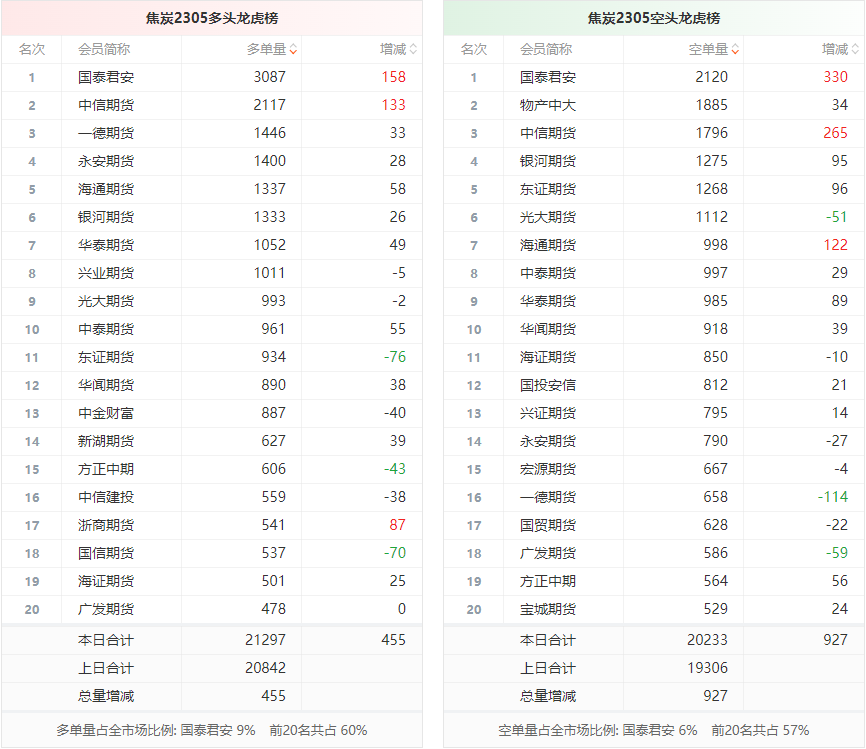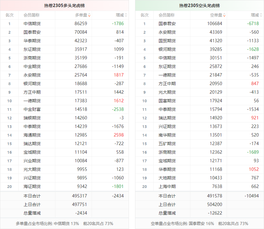 截至3月20日收盘,螺纹钢2305收4194/吨,跌0.94%;热卷2305收4305/吨,跌0.55%;铁矿石2305收883元/吨,涨0.44%;焦炭2305收2746/吨,跌1.38%;焦煤2305收1863.5元/吨,跌0.56%。 螺纹钢2305合约前20席位多单减仓20054手至101万余手,空单减仓13228手至100.7万余手。其中,国泰君安期货多单减持3744手,空单减持14189手,整体呈净空144226手。 各品种具体如下: ![]() (来源:东方财富期货PC端) 各品种持仓情况具体如下: ![]() ![]() ![]() ![]() ![]() (文章来源:东方财富研究中心) (责任编辑:admin) |