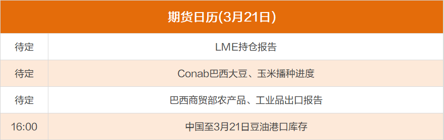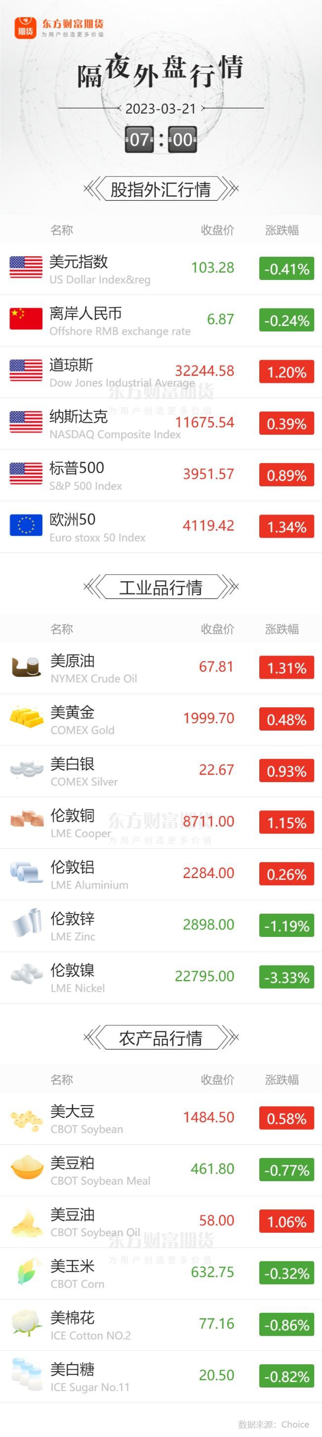 外盘收报![]() 每日精选金价站上2000美元!距历史前高一步之遥 黄金牛市又要来了? 大商所:希望与山东省港口集团进一步深化在铁矿石等期货品种交割管理与服务等领域合作 农业农村部:坚决查处恶意散布虚假动物疫情信息、牟利套利等行为 宏观产经澎湃新闻:超预期降准0.25个基点后,LPR并未随之调降,跟随MLF利率连续七个月按兵不动。中国人民银行授权全国银行间同业拆借中心公布,2023年3月20日贷款市场报价利率(LPR)为:1年期LPR为3.65%,5年期以上LPR为4.3%,均与上月保持一致。(查看原文) 财联社:海关总署署长俞建华今日在新闻发布会上表示,对于空箱的问题,我们也在关注。这里面有前一个时期新集装箱投放量过大、国内堆存成本较低、国外疫情缓解后空箱短期大量回流的原因,也有季节性规律作用。大量空箱在我国港口蓄势待发,某种程度上也反映了国际市场依然看好我们下一阶段的出口能力。从海关最新数据看,2月下旬以来,出口用箱量在持续增长。 广东省人民政府办公厅:设立广东省新型储能产业天使投资基金,重点投向种子期、初创期、成长期科技型企业,建立早、中期创投和重大产业项目让利机制。用好政策性开发性金融工具、制造业中长期贷款等,支持新型储能项目建设。加快广州期货交易所电力和碳排放权期货品种研究和上市。 品种资讯黑色系&金属期货 螺纹钢:钢银电商20日公布数据显示,截至3月20日的一周,国内39个城市,共计146个仓库的钢铁总库存量为1223.99万吨,环比减少43.61万吨,降幅3.44%。其中,建筑钢材库存总量为742.38万吨,较上周环比减少28.39万吨,降幅3.68%;热卷库存总量为287.50万吨,较上周环比减少10.10万吨,降幅3.39%;中厚板库存总量为79.31万吨,较上周环比减少2.12万吨,降幅2.60%;冷轧涂镀库存总量为114.80万吨,较上周环比减少3.00万吨,降幅2.55%。(新华财经) 3月20日,全国174家长、短流程代表钢厂废钢库存总量474.92万吨,较上周五增9.73万吨,增2.09%;库存周转天11天,较上周五增0.2天;日消耗总量41.34万吨,较上周五增0.59%;日到货总量44.59万吨,较上周五降3.43%。(Mysteel) 铁矿石:大商所党委书记、理事长冉华表示,山东港口是我国铁矿石等大宗干散货进口的主要港口,能够在提升我国大宗商品价格影响力过程中发挥重要作用。希望双方未来进一步深化在铁矿石等期货品种交割管理与服务等领域的合作。(财联社) 煤炭:能源价格走低,进口煤优势扩大,兼营船外流,沿海运力趋紧,同时国内煤价震荡后趋稳,前期观望需求陆续释放,沿海煤炭运价涨幅有所扩大。(上海航运交易所) 中信证券指出,短期煤价以波动为主,虽然海外大宗商品价格普遍出现了调整,影响短期板块情绪,但降准等政策依然有利于需求预期的修复。目前板块在估值及股息率的预期方面依然具备明显吸引力,有一定的安全边际,后续在需求预期的改善下,板块或迎来反弹。(财联社) 铝:国际铝业协会(IAI)数据显示,2月份全球原铝产量为527.3万吨,去年同期为513.5万吨,前一个月修正值为582.3万吨;日均产量为18.83万吨,前一个月为18.78万吨。预计2月中国原铝产量为310.7万吨,前一个月修正值为342.8万吨。(新华财经) 黄金:近期影响市场运行的不确定性因素较多,市场风险明显加剧,价格波动显著增大。请各会员单位提高风险防范意识,做细做好风险应急预案,提示投资者做好风险防范工作,合理控制仓位,理性投资。(上金所) 3月20日,现货黄金站上2000美元/盎司,为2022年3月来首次,较日低走高超30美元。COMEX黄金期货价格触及2000美元上方,距离2020年8月历史最高点2089美元/盎司仅一步之遥。上周单周价格涨幅高达6%。(第一财经) 农产品期货 生猪:日前,农业农村部印发《关于做好春季动物疫病防控工作的通知》,部署加强非洲猪瘟等重大动物疫病常态化防控和重点人畜共患病源头防控,维护畜牧业生产安全、公共卫生安全和国家生物安全。《通知》强调,按照2023年“清朗”系列专项行动计划,会同有关部门坚决查处恶意散布虚假动物疫情信息、牟利套利等行为,维护正常生产经营秩序。(农业农村部) 对于本轮猪周期的判断,温氏股份表示,行业普遍认为,本轮猪周期从2022年4月开始,2022年10月涨至阶段性14元/斤的高点,变化速度和幅度均超过行业预期。按照历史猪周期表现,一般行业周期高点都会伴随着内外资本疯狂投入的阶段,产能建设和扩张处于非理性状态,但本轮周期尚未出现此种情况,因此,从这个角度来看,本轮周期尚未结束。(经济参考网) 据国家发改委,截至3月15日,全国生猪出场价格为15.49元/公斤,比3月8日下跌2.39%;主要批发市场玉米价格为2.92元/公斤,较3月8日持平;猪粮比价为5.30,比3月8日下跌2.39%。(发改委) 大豆:农业农村部农垦局近日印发《2023年农垦带头扩种大豆油料行动工作方案》,农垦将继续开展带头扩种大豆油料行动,着力从面积、单产、管理、辐射带动等方面挖潜力提单产增总产,持续提升大豆油料供给保障能力。(新华网) 苹果:下一步,郑商所将继续深入研究苹果产业发展趋势,持续完善合约规则,不断理顺交割体系,优化交割布局,更好满足产业需求。同时,严厉打击市场违法违规行为,有力保障苹果期货稳定运行、健康发展。(郑商所) 棉花:2022/23年度,受到疫情影响,新疆棉花测产、收购、加工、公检工作均受到不同程度影响,国家棉花市场监测系统对全国棉花种植面积及产量最新调查数据
