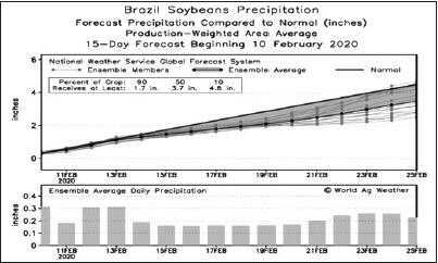 巴西大豆1月起开始收获,目前本年度收获进度略有落后。根据AgRural数据, 截至2月6日,巴西大豆收获进度为16%,落后于去年同期的26%,但远高于五年均值。2月报告USDA将2019/2020年度预计出口量略上调100万吨,至7700万吨,高于过去两年。得益于东北部大豆产区良好的天气,2月报告将预计产量由1.23亿上调至1.25亿吨,同比上浮5.1%,超过2017/2018年度的1.22亿吨。