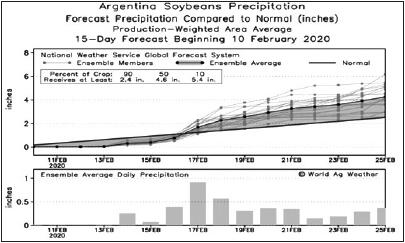 根据USDA本月数据,2019/2020年度阿根廷大豆产量预计约为5300万吨,同比下滑4.2%,预计出口820万吨,较上一年度910万吨下降9.9%。BAGE报告显示,截至1月29日,本季阿根廷大豆已全部完成种植,种植速度与上一年度基本持平,总播种面积为1740万公顷,略低于去年1790万公顷。