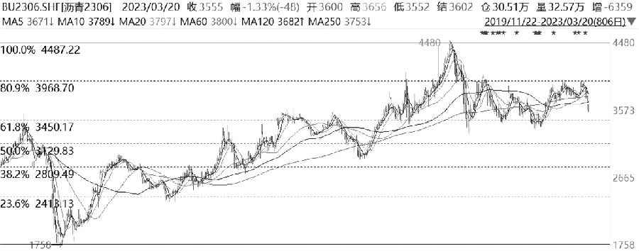 2022年3月初,原油期货见顶后呈振荡下行走势。近期,原油期货跌破535元/桶重要支撑位,价格临近下跌通道下沿,若向下形成突破,下行空间将会被打开。均线方面,均线系统呈现空头排列,显示价格开始转弱。指标方面,MACD指标、KDJ指标、RSI指标死叉后持续发散,说明价格走势偏弱。量仓方面,近期原油期价下挫伴随着明显的增仓放量,说明下跌动能充足。综上,原油期货跌破重要支撑位,价格将继续走弱。操作上,前期空单继续持有,若价格跌破470元/桶,空仓投资者可建立空单。 沥青 检验箱体下沿