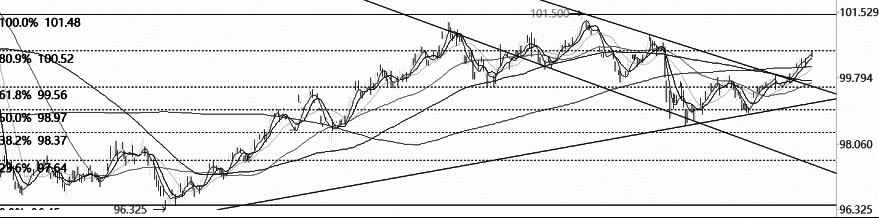 十年期国债期货上冲前高101.5点的压力位受阻,价格持续回落,直至黄金分割0.5对应的99点的支撑位才企稳。目前,构筑了一个小的W底,价格突破下跌通道上沿和W底的颈线位,临近黄金分割0.809对应的100点的压力位。 均线方面,呈现多头排列,表明整体走势强劲。指标方面,MACD指标金叉后持续发散,表明走势处于偏强格局;KDJ指标、RSI指标高位死叉,表明上涨存在隐患。另外,上涨过程中,量仓相对稳定。 结合上述分析预测,十年期国债临近重要压力位,指标死叉,价格存在小幅回调的需求。(新疆果业 黄李强) (责任编辑:admin) |