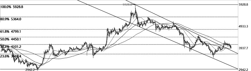 IF主力连续合约在跌至黄金分割0.236对应的3670点的支撑位后止跌,遂向上突破下跌通道上沿,但在黄金分割0.382对应的4100点的压力位后受阻,转头回落。 均线方面,短期均线下穿长期均线,均线系统出现空头排列迹象。指标方面,MACD指标死叉后没有明显的金叉迹象,表明走势仍然趋弱,但KDJ指标、RSI指标低位金叉,表明价格存在反弹需求。 结合上述分析预测,IF整体弱势格局不改,但摆动指标和强弱指标出现走强迹象,价格或有短线反弹。 IC 冲高受阻