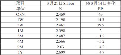 本周,国内市场利率呈现短强长弱格局。一方面,随着季末的临近,市场对于短期限资金的需求明显上升,短期限利率大幅上升;另一方面,受央行降准的影响,中长期利率下降。截至3月21日,上海银行间同业拆放利率(Shibor)周度、1周期、2周期、1月期利率分别报收于2.459%、2.198%、2.461%、2.398%,较3月14日分别上升63、14.3、39.5、2个基点;3月期、6月期、9月期、1年期利率分别报收于2.487%、2.566%、2.63%、2.699%,较3月14日分别下降1.2、3.2、4.2、4.7个基点。 为了平抑季末资金需求,央行近期加大逆回购投放量。近5个工作日,央行累计到期逆回购920亿元,同期开展逆回购6050亿元,实现净投放5130亿元。此外,央行3月17日宣布,于3月27日降低金融机构存款准备金率0.25个百分点。此次调整之后,国内大型存款类金融机构的存款准备金率为10.75%,中小型存款类金融机构存款准备金率为7.75%。