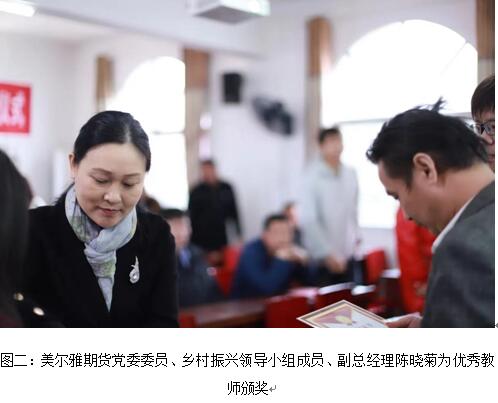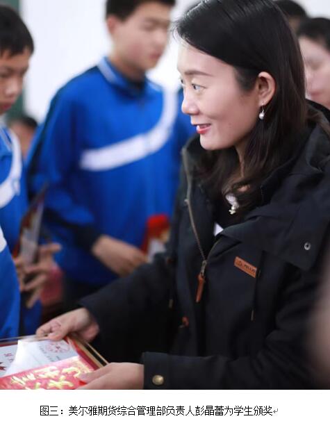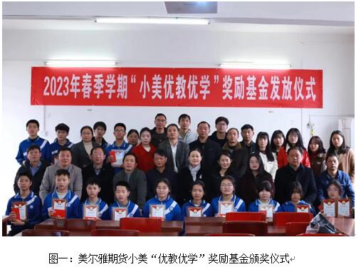 3月21日,黄冈市蕲春县桐梓中学2023年春季学期小美“优教优学”奖励基金颁奖仪式举行,美尔雅期货有限公司(以下简称“美尔雅期货”)党委委员、乡村振兴领导小组成员、副总经理陈晓菊代表公司,向15名优秀教师和15位品学兼优的学生送出奖励,蕲春县乡村振兴局工会主席陈小兵、桐梓中学校长田幼学等出席仪式。