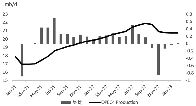 随着OPEC+供应端的下降、美国SPR酸油释放的结束、酸油与燃油炼厂投料需求的提升、甜油酸油矛盾的缓和、成品油与副产品矛盾的缓解,高硫裂解价差从-37美元/桶持续上涨至目前的-15美元/桶。 供应下降 OPEC+于去年11月减产200万桶/日,主要减产对象为中东四国,即沙特、阿联酋、科威特以及伊拉克。算上伊朗、委内瑞拉与俄罗斯,OPEC+七国产量(涉及原油品质主要为中重质含硫原油,简单加工下高硫出率偏高)从2022年10月的3471万桶/日下降至2023年2月的3332万桶/日。