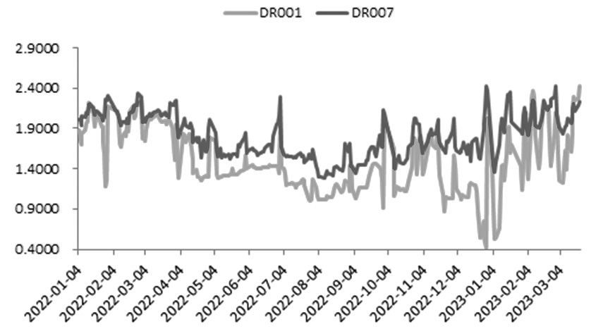 图为社会消费品零售总额当月同比走势 房地产方面,虽然2月开发投资当月同比出现较大改善,降幅缩窄至5.73%,但仍处于负增长状态。另从30个大中城市商品房成交面积来看,虽然3月以来日均成交面积较去年同比有所提高,但与疫情前相比仍有较大差距。目前房地产和消费的恢复更像是疫情抑制后的需求释放,结构性问题改善前,持续性有待观察。 其二,货币政策更加偏向结构化调整,总量政策相对谨慎。 3月受海外金融市场风险事件影响,全球避险情绪升温,中国人民银行采取了较为谨慎的态度,当月增量投放MLF的同时降准,这对于债券市场有所提振,但中长期看货币政策对于债市的利多作用逐步减弱。年初以来,国内信贷总量大幅增长,但货币市场流动性大幅收敛,银行间隔夜回购利率中枢随之上移,2月以来隔夜回购利率加权平均值始终处在1.8%上方,且多次上穿2%。虽然中国人民银行加大了公开市场逆回购投放力度,但资金利率回落并不明显,这促使本月央行增量续作MLF及降准。 降准有利于边际改善资金面,但资金面过于宽松的格局一去不复返,资金利率中枢向政策利率靠近是中长期趋势。此外,在当下经济弱复苏的时候,货币政策重在为经济保驾护航以及为经济薄弱领域提供支撑,这意味着货币政策以结构性为主、总量为辅。后市伴随着经济的进一步复苏,货币政策的力度将逐步收敛,其对于国债期货的支撑也会相对有限。