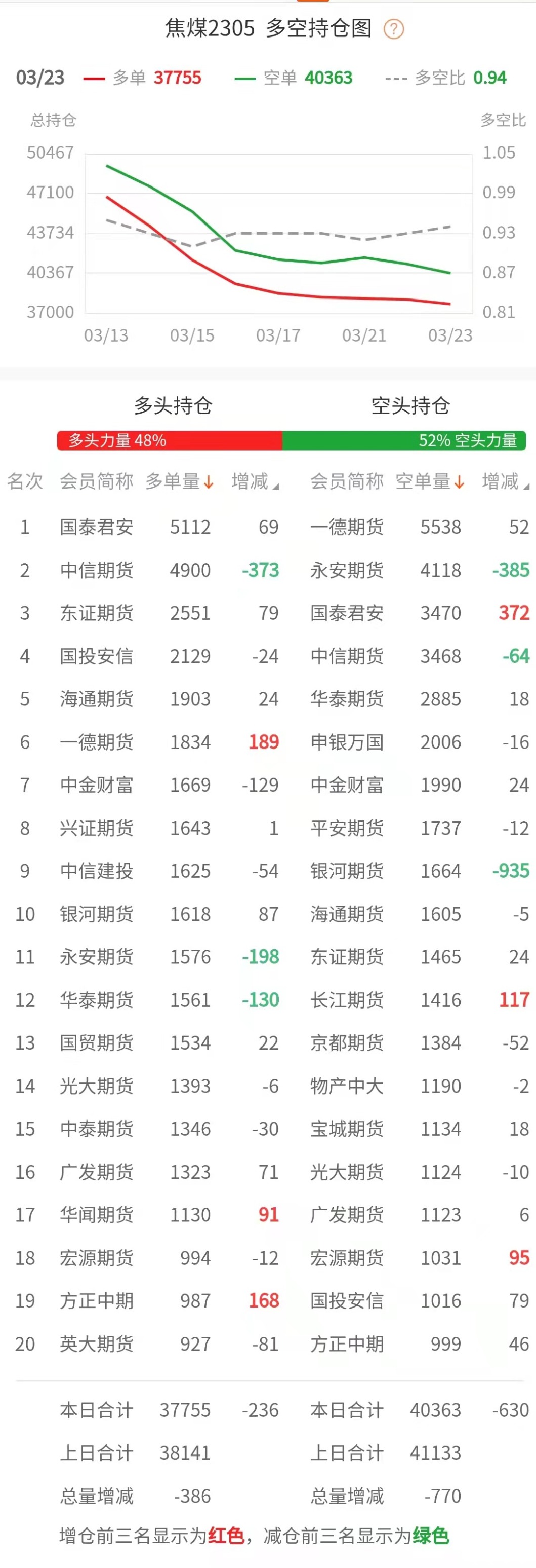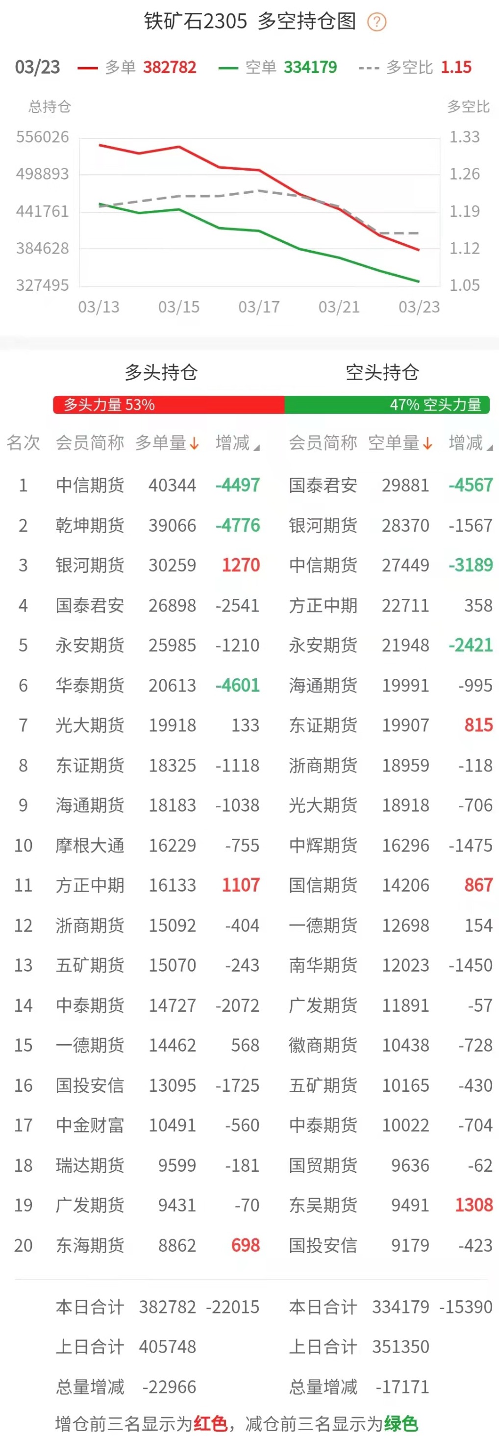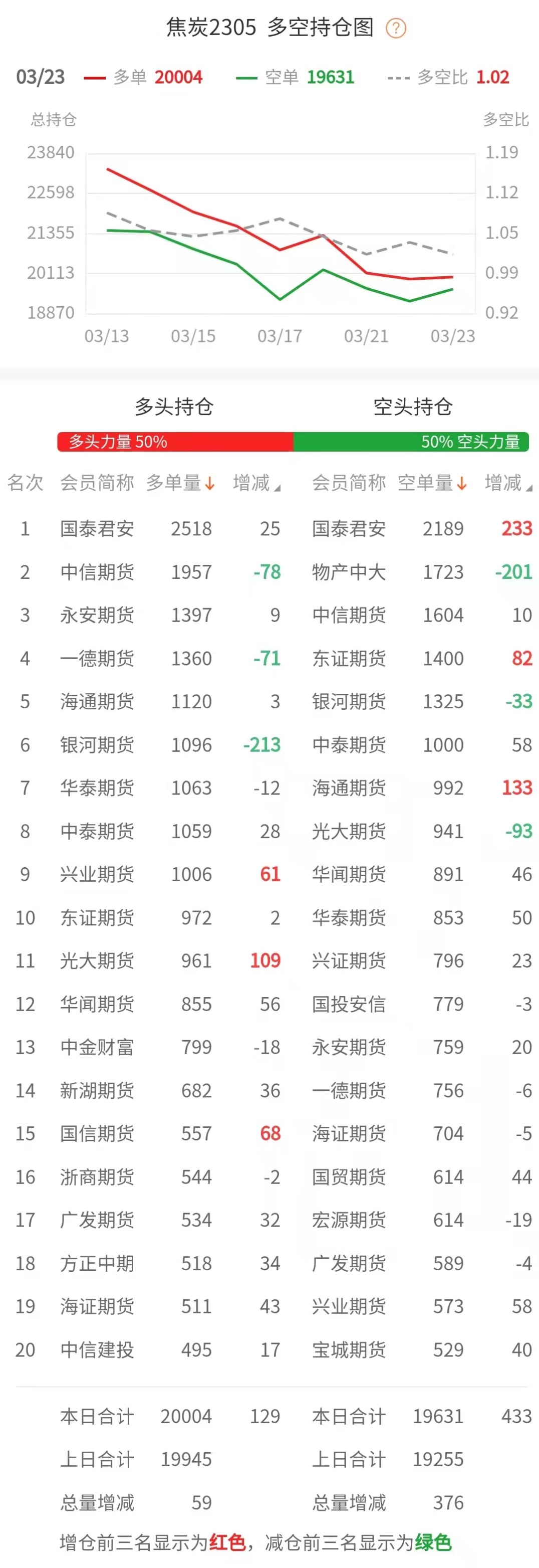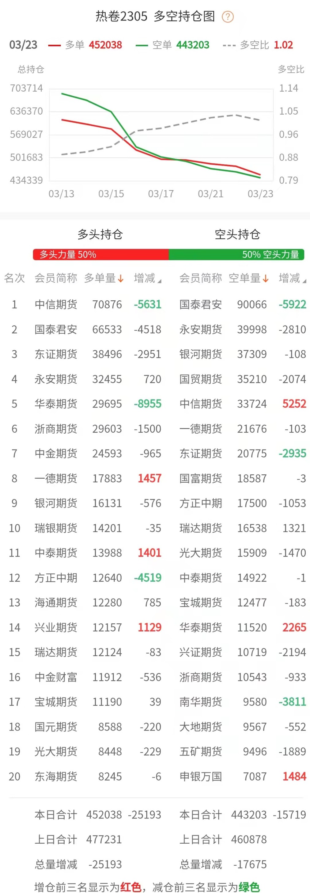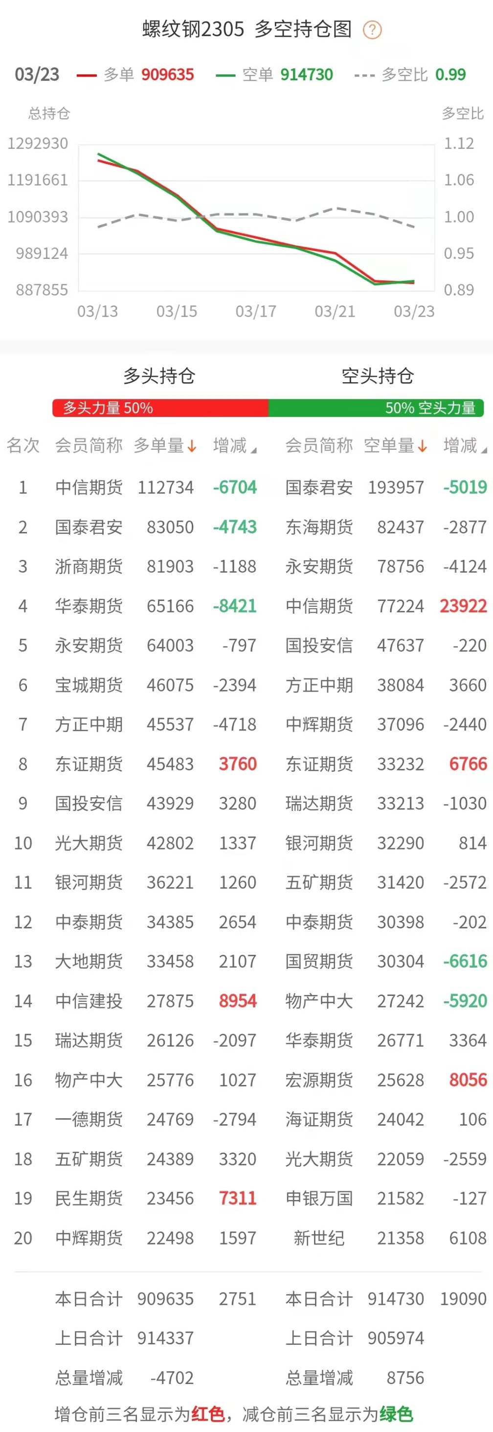 截至3月23日收盘,螺纹钢2305收4070/吨,跌2.02%;热卷2305收4221/吨,跌1.42%;铁矿石2305收854元/吨,跌2.01%;焦炭2305收2692.5/吨,跌0.99%;焦煤2305收1818.5元/吨,跌0.36%。 螺纹钢2305合约前20席位多单增仓2751手至90.9万余手,空单增仓19090手至91.4万余手。其中,中信期货多单减持6704手,空单增持23922手,整体呈净多35510手。 各品种具体如下: ![]() 各品种持仓情况具体如下: ![]() ![]() ![]() ![]() ![]() 注:可通过点击东方财富期货PC端左侧“龙虎榜”栏目及东方财富期货APP行情页面“龙虎榜”栏目查看各类机构持仓及盈亏榜单信息。 ![]() ![]() (文章来源:东方财富研究中心) (责任编辑:admin) |