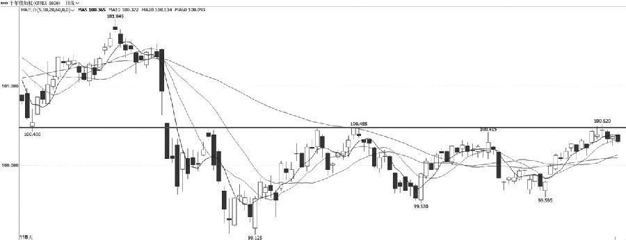 IF加权本周价格出现一定反弹,但整体仍旧处于2月份以来的下降通道之内。量能方面,近期反弹过程中成交量有所缩小,持仓量出现一定下滑。指标方面,均线系统目前排列较为混乱,MACD指标快慢线在零轴下方有望交出金叉。综合来看,IF加权近期出现反弹,一旦价格向上突破下降通道上沿压力,且MACD指标交出金叉,建议可以偏多思路对待。 十债 遇阻回落