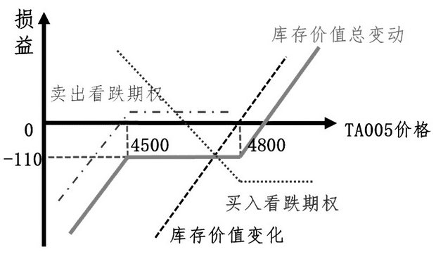 PTA场内期权上市后,在库存保值方面,贸易商可以买入PTA看跌期权进行套期保值操作,原理与上文中的聚酯工厂采购套保类似,通过持有看跌期权多单,在下跌行情中对库存进行保值,在上涨行情中规避持仓风险。为进一步降低策略成本,贸易商可以在买入看跌期权的基础上卖出更低行权价格的看跌期权。当前TA005价格在4750元/吨附近,行权价格为4800元/吨的看跌期权价格约为160元/吨,行权价格为4500元/吨的看跌期权价格约为50元/吨,策略净成本约为110元/吨。当TA005处于4500—4800元/吨之间,期权组合的收益部分抵消由于PTA价格下跌对库存价值带来的影响,而当PTA价格上涨时,库存价值不会受套保策略的影响。